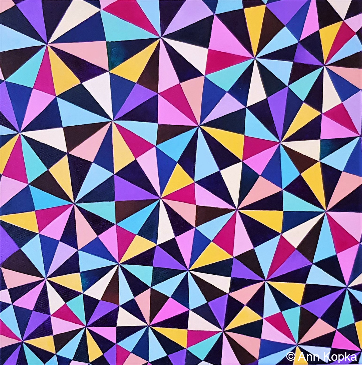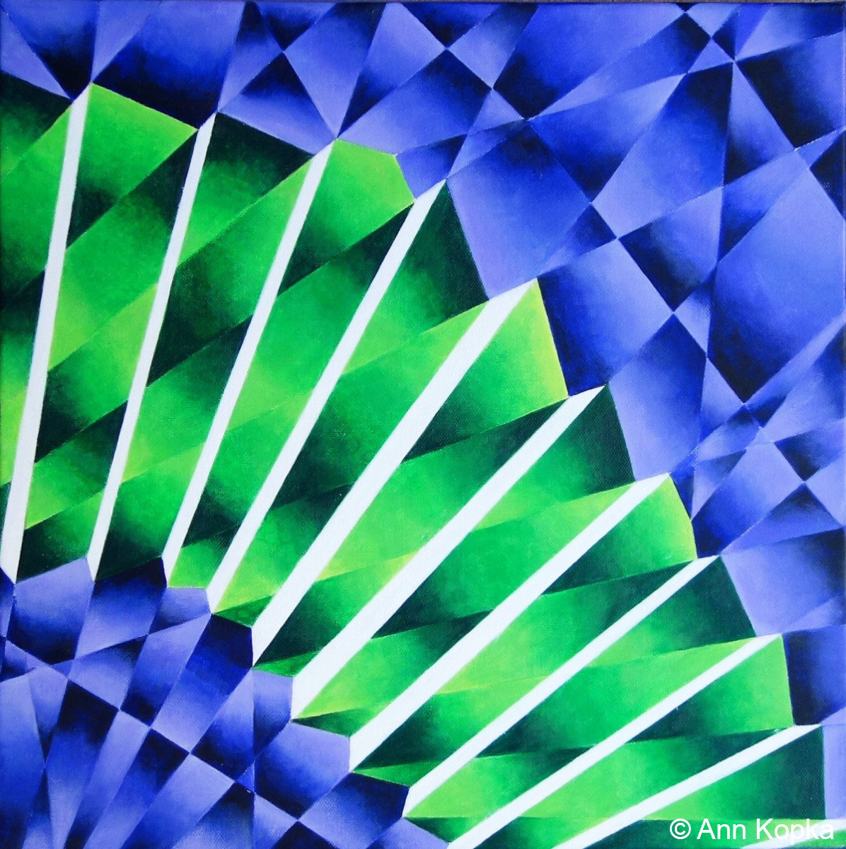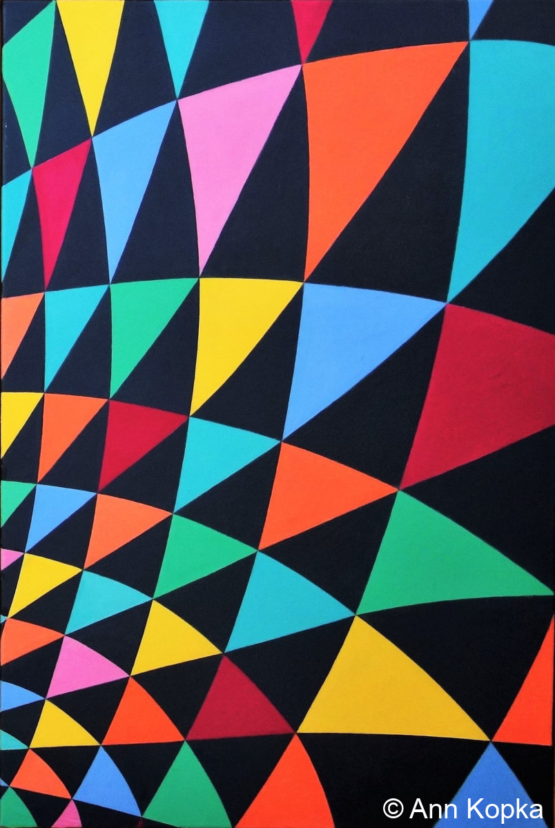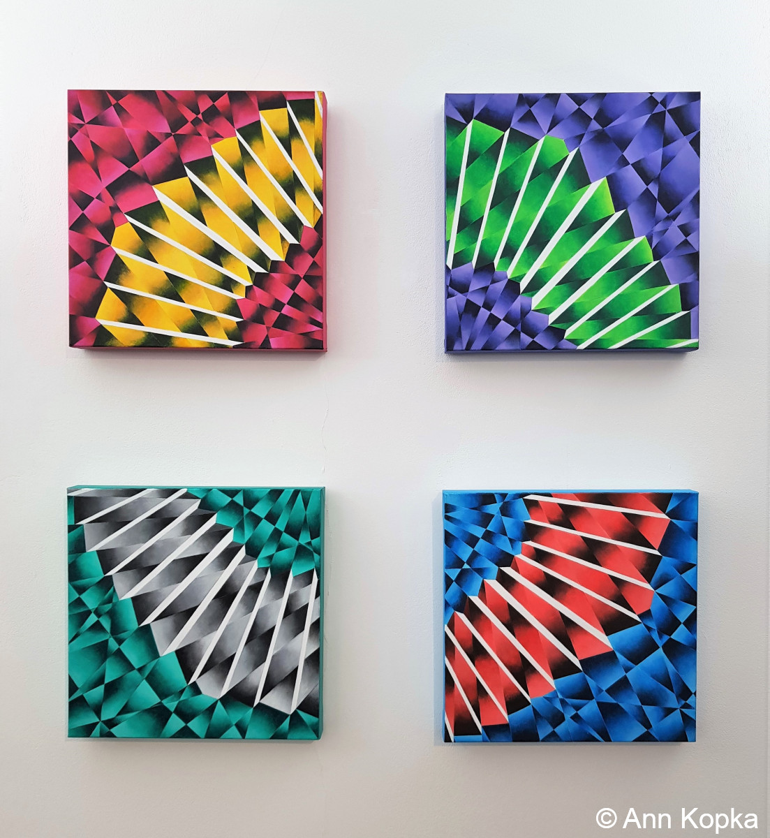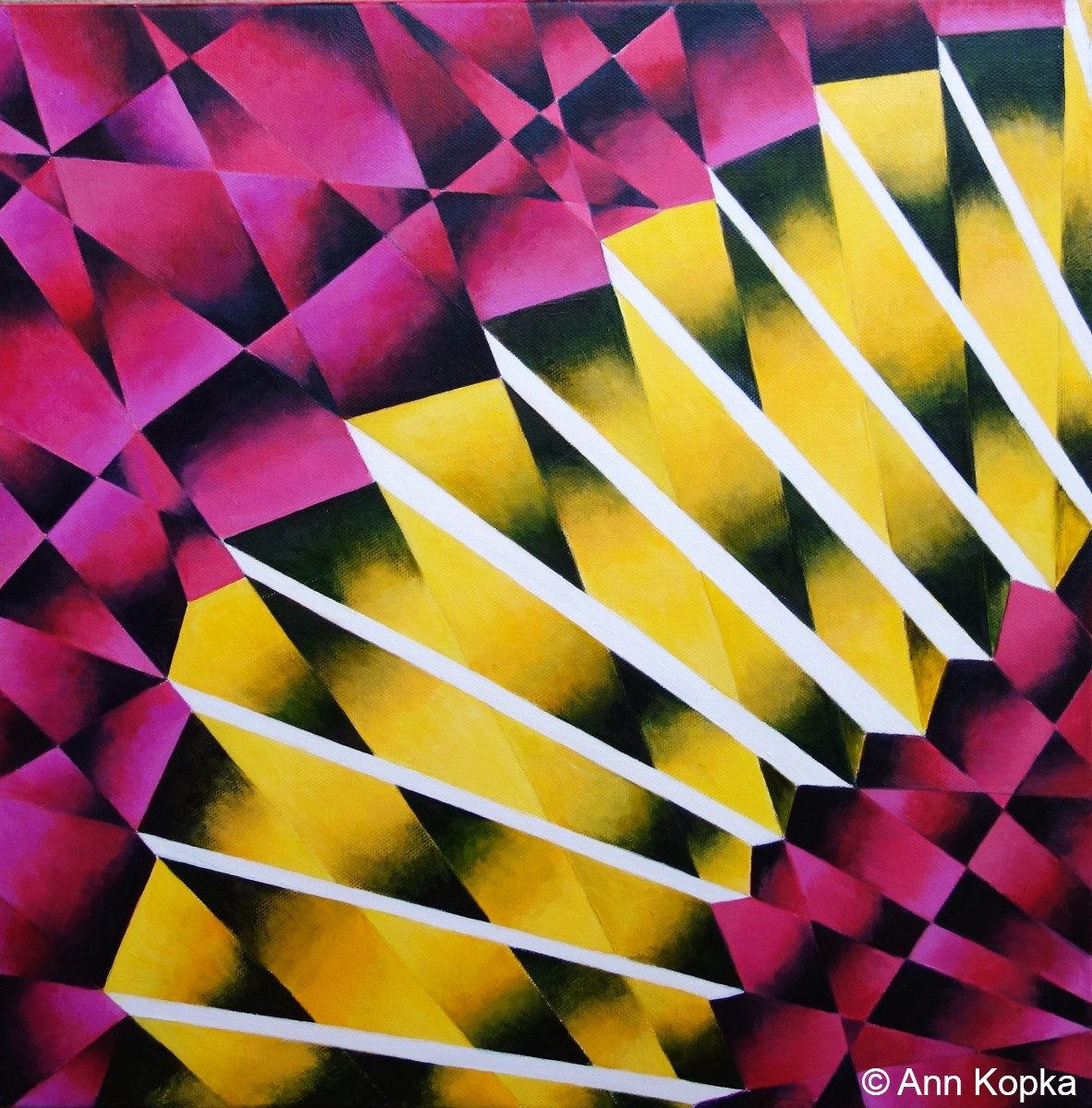Geometric paintings informed by Ann Kopka’s fascination with the relationships between geometry, design and structures found in both urban and natural landscapes. Her colourful vibrant paintings explore the connections between colour and rhythm, structure and scale, repetition, and pattern. Ann’s paintings ‘grow’ through the subtle application of multiple layers of vivid acrylic colour. Colour is employed not to be representational but to convey light and energy, emphasise the circulation of movement and bind the network of structures together into a coherent picture. The slow buildup of vibrant saturated surfaces results in paintings that can have an illusion of depth sometimes with distinctive three-dimensional qualities, contradicting the defining flatness of abstract art and yet in art historical terms allude to analytical cubism, constructivism, op-art, and geometric abstraction.