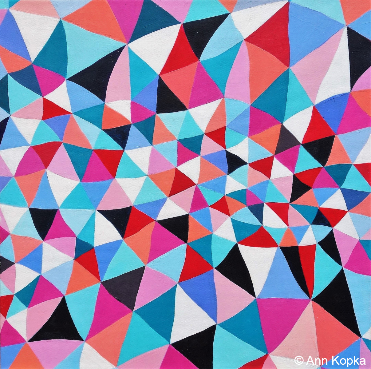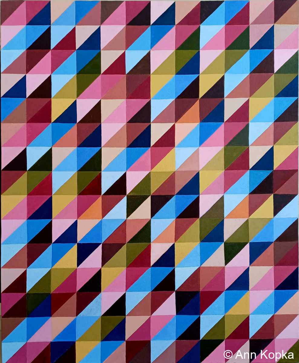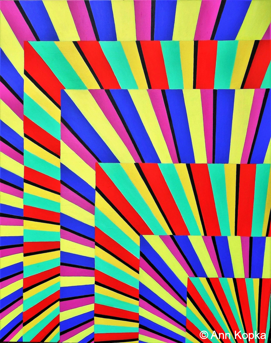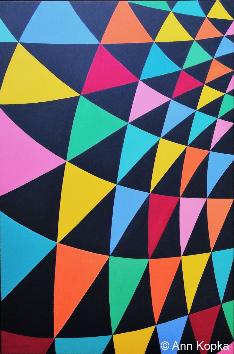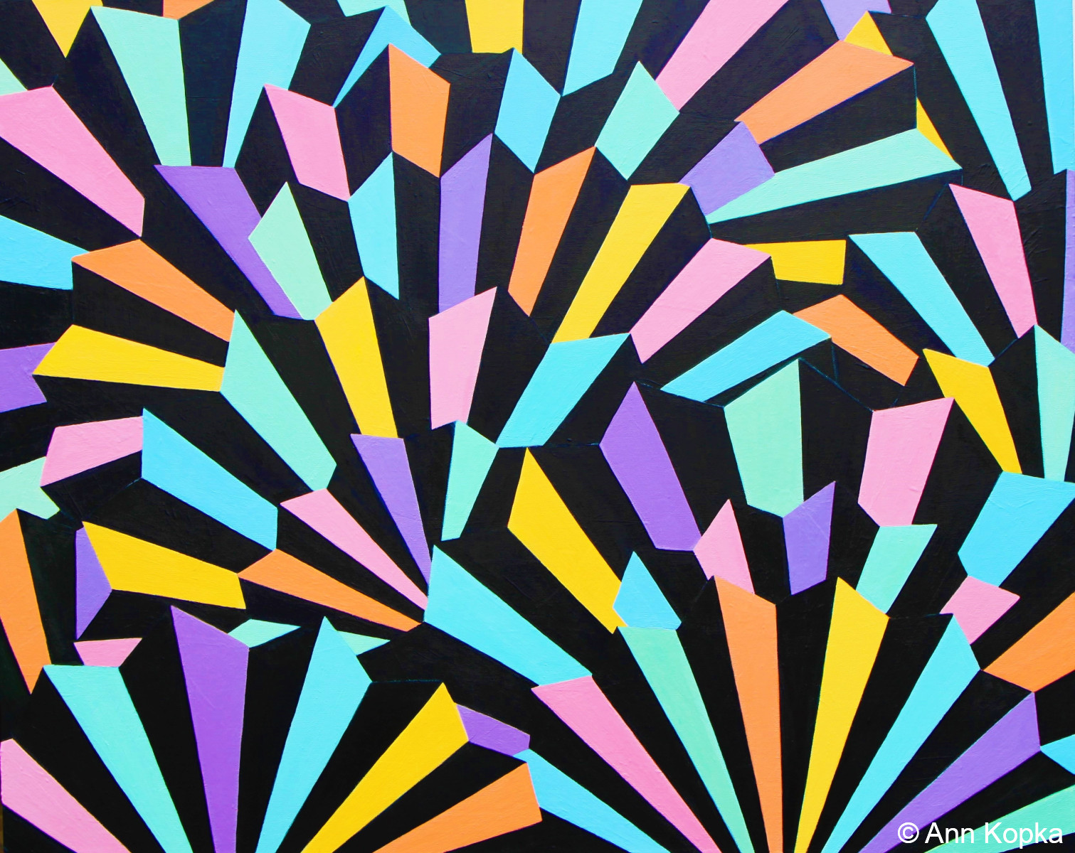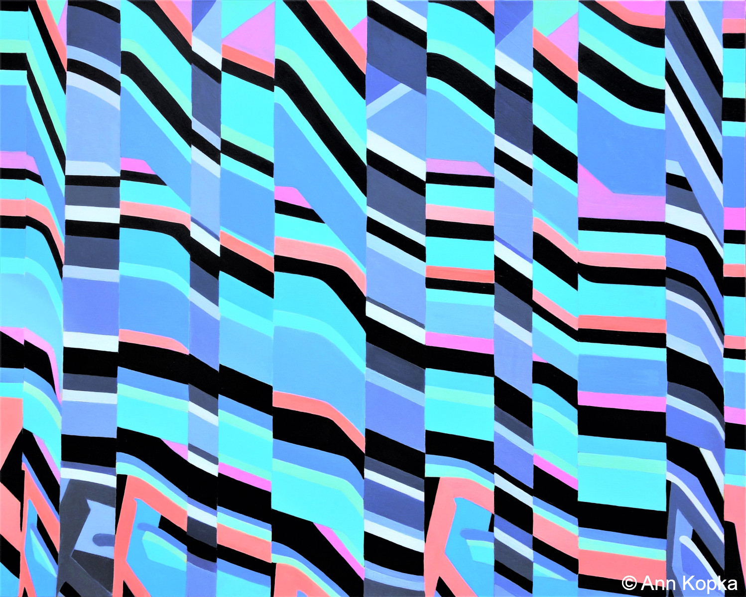 Geometric paintings informed by Ann Kopka’s fascination with the relationships between geometry, design and structures found in both urban and natural landscapes. Her colourful vibrant paintings explore the connections between colour and rhythm, structure and scale, repetition, and pattern. Ann’s paintings ‘grow’ through the subtle application of multiple layers of vivid acrylic colour. Colour is employed not to be representational but to convey light and energy, emphasise the circulation of movement and bind the network of structures together into a coherent picture. The slow buildup of vibrant saturated surfaces results in paintings that can have an illusion of depth sometimes with distinctive three-dimensional qualities, contradicting the defining flatness of abstract art and yet in art historical terms allude to analytical cubism, constructivism, op-art, and geometric abstraction.