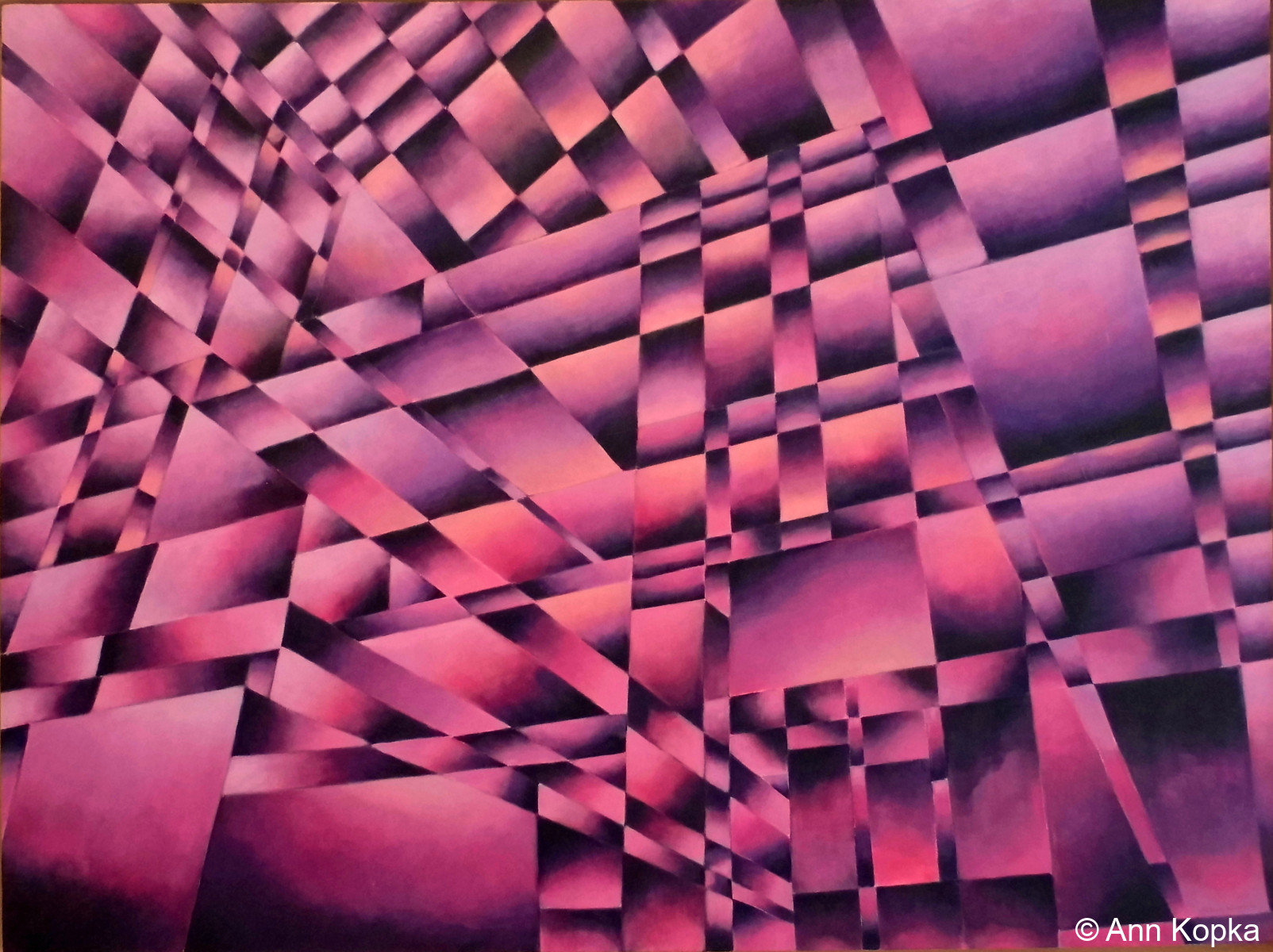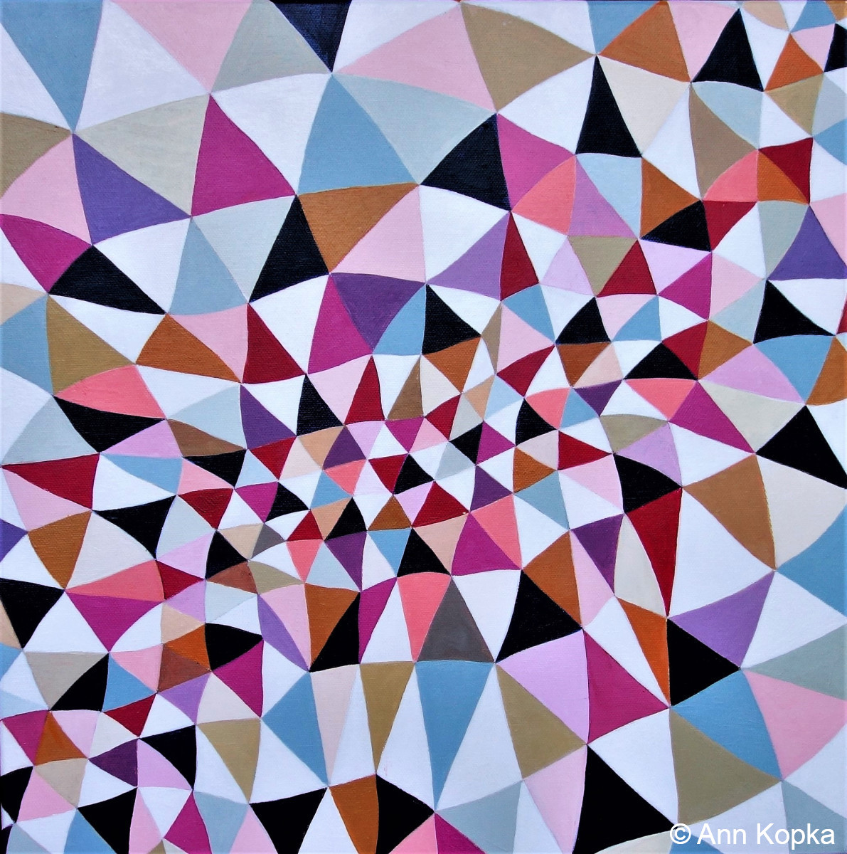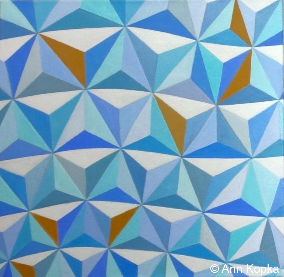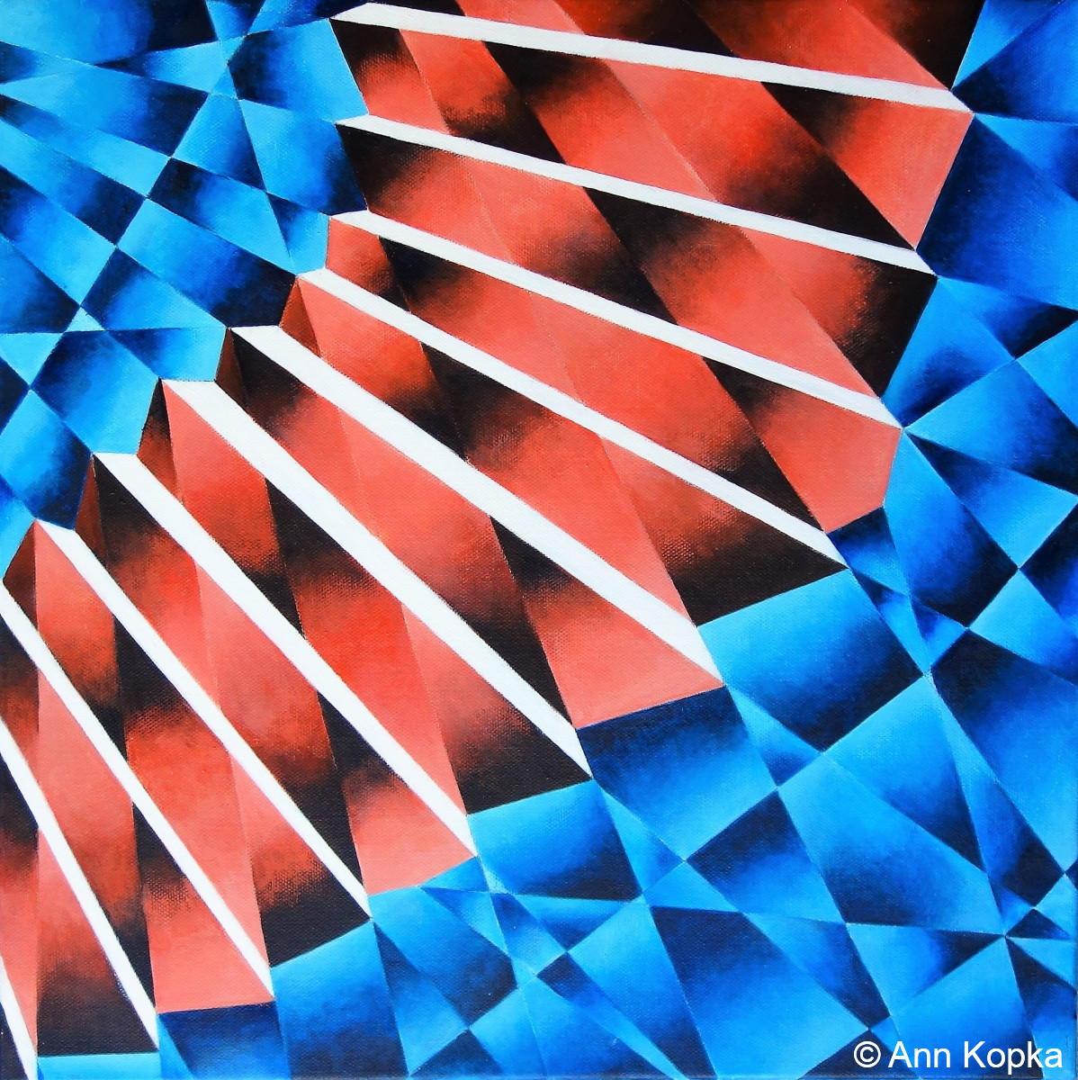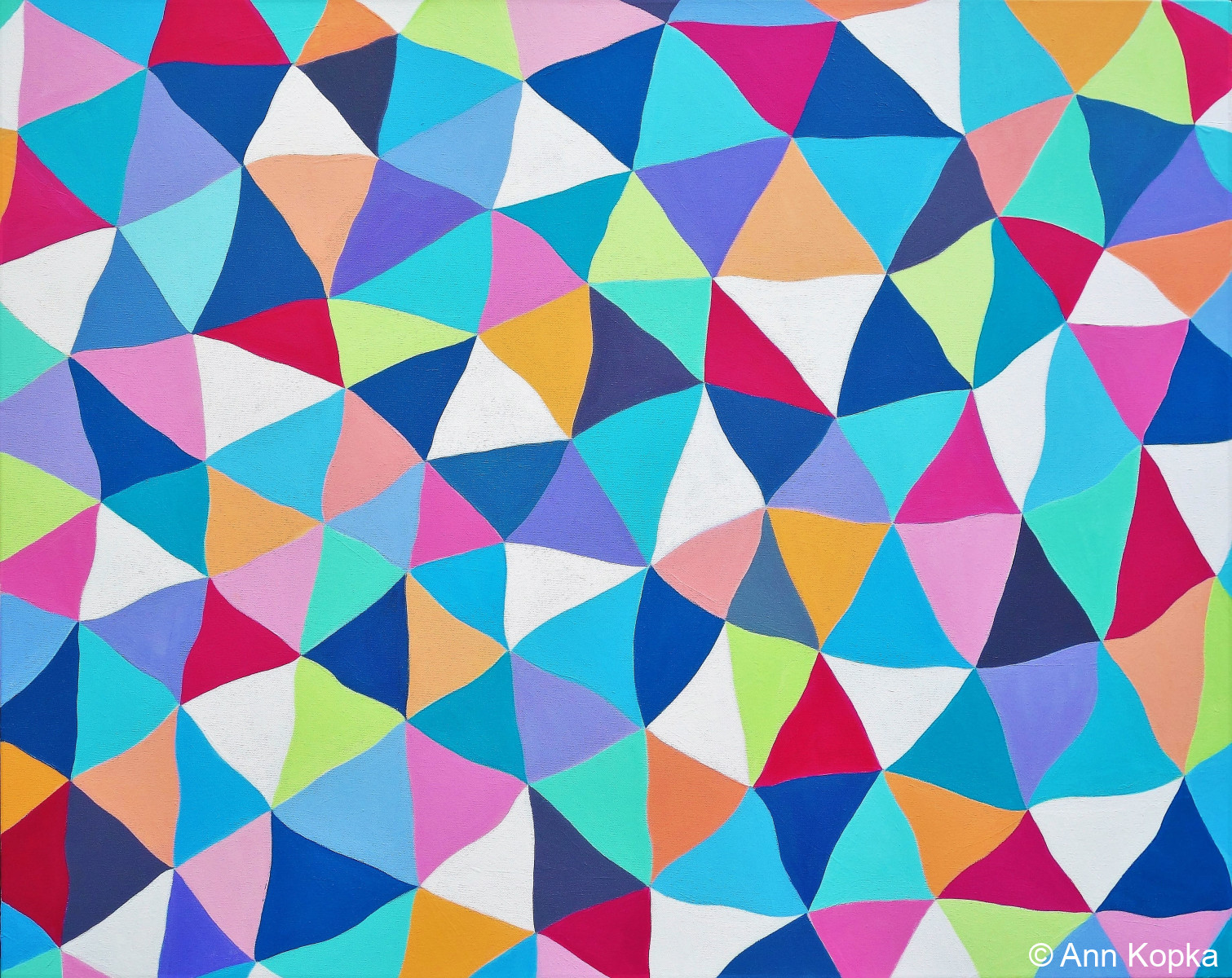 Geometric paintings informed by Ann Kopka’s fascination with the relationships between geometry, design and structures found in both urban and natural landscapes. Her colourful vibrant paintings explore the connections between colour and rhythm, structure and scale, repetition, and pattern. Ann’s paintings ‘grow’ through the subtle application of multiple layers of vivid acrylic colour. Colour is employed not to be representational but to convey light and energy, emphasise the circulation of movement and bind the network of structures together into a coherent picture. The slow buildup of vibrant saturated surfaces results in paintings that can have an illusion of depth sometimes with distinctive three-dimensional qualities, contradicting the defining flatness of abstract art and yet in art historical terms allude to analytical cubism, constructivism, op-art, and geometric abstraction.