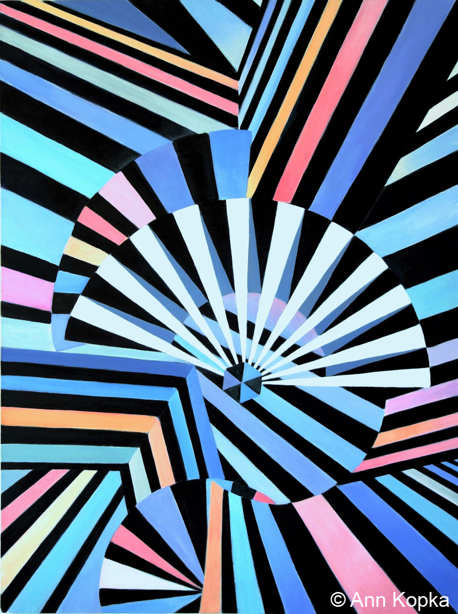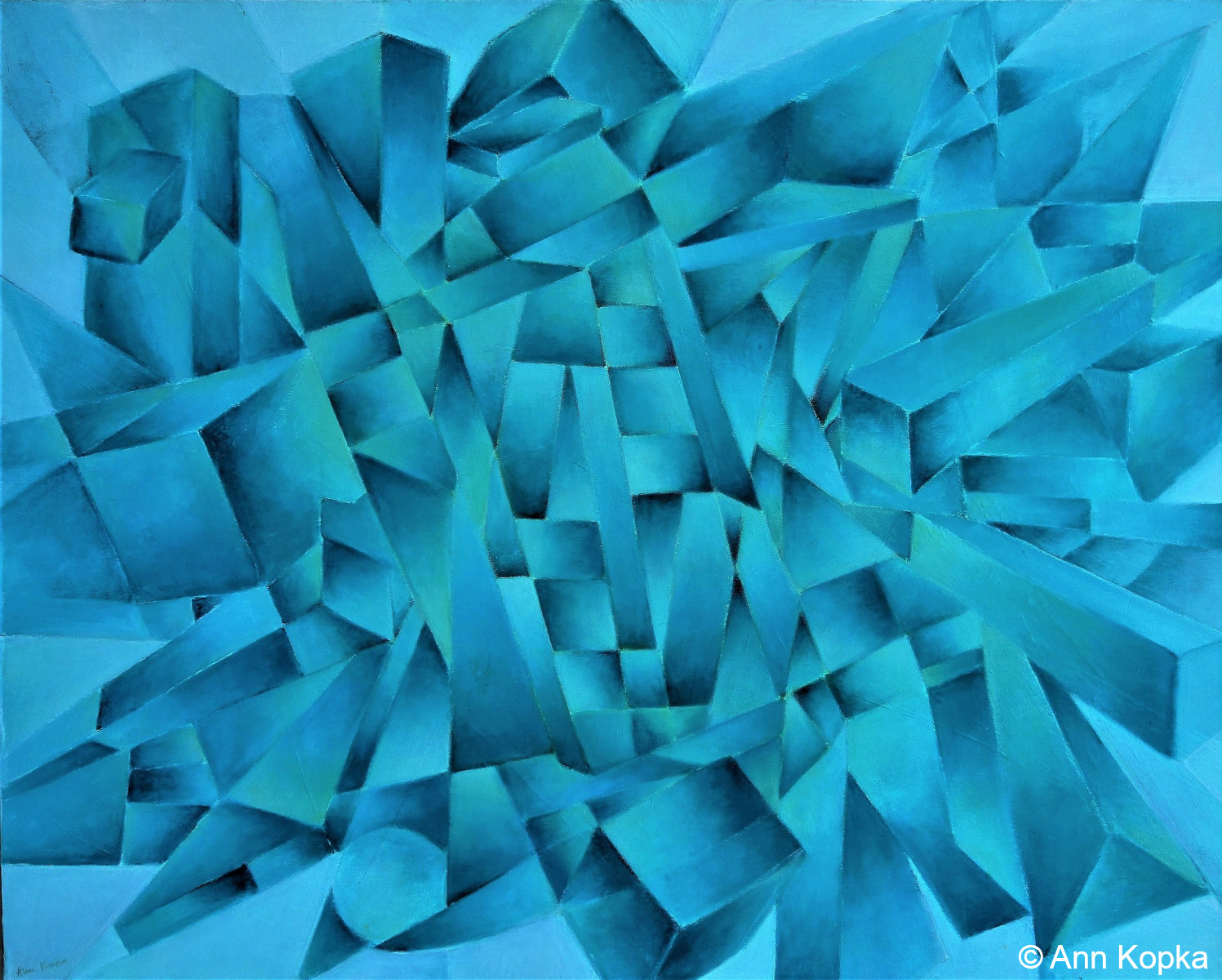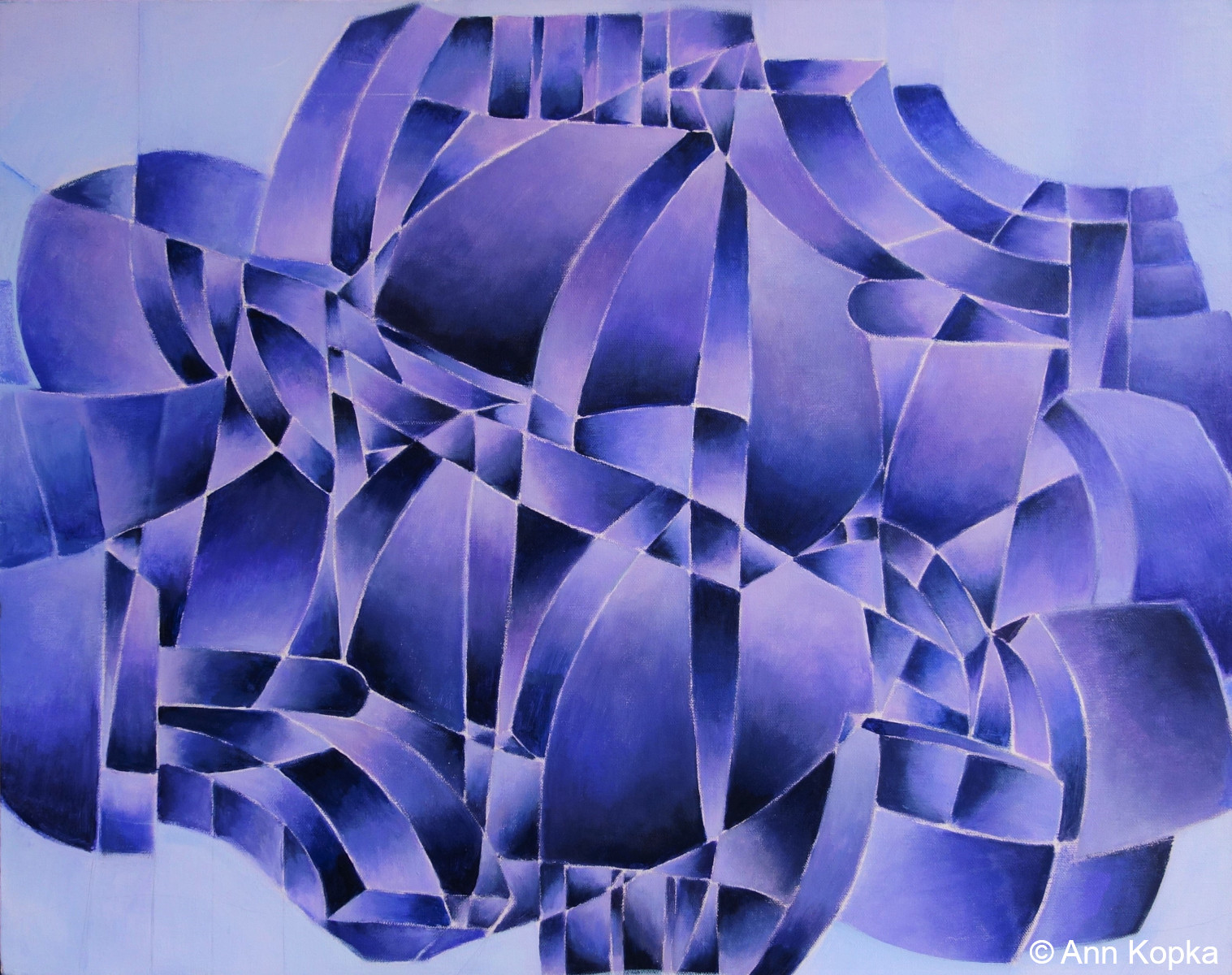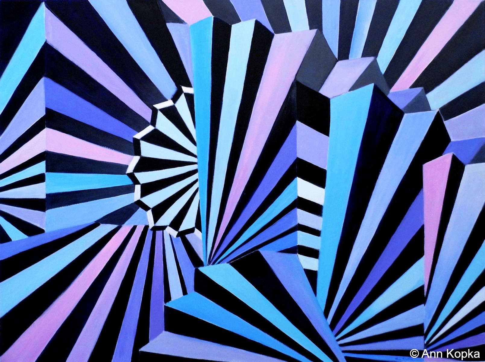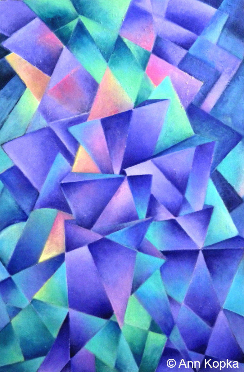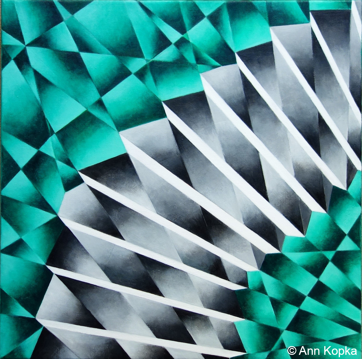 Geometric paintings informed by Ann Kopka’s fascination with the relationships between geometry, design and structures found in both urban and natural landscapes. Her colourful vibrant paintings explore the connections between colour and rhythm, structure and scale, repetition, and pattern. Ann’s paintings ‘grow’ through the subtle application of multiple layers of vivid acrylic colour. Colour is employed not to be representational but to convey light and energy, emphasise the circulation of movement and bind the network of structures together into a coherent picture. The slow buildup of vibrant saturated surfaces results in paintings that can have an illusion of depth sometimes with distinctive three-dimensional qualities, contradicting the defining flatness of abstract art and yet in art historical terms allude to analytical cubism, constructivism, op-art, and geometric abstraction.