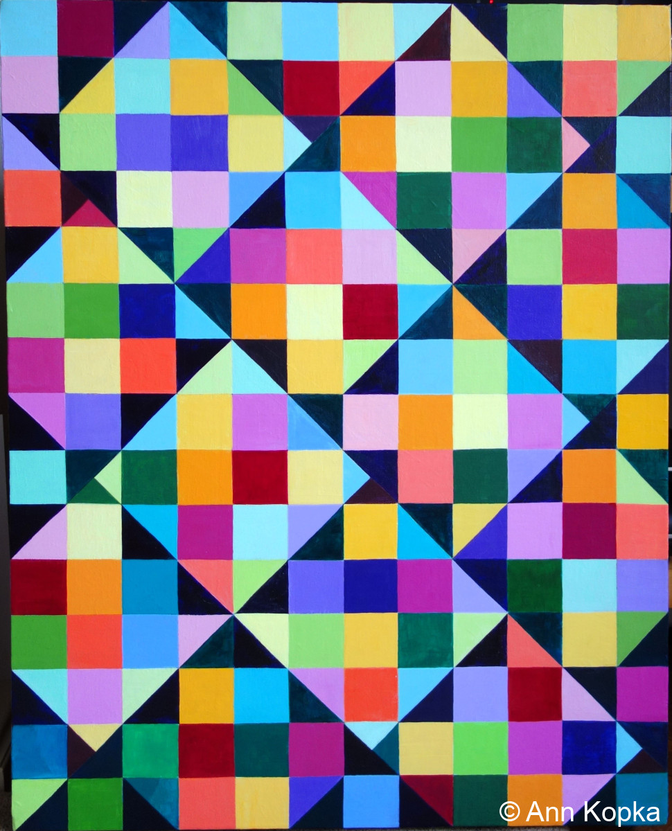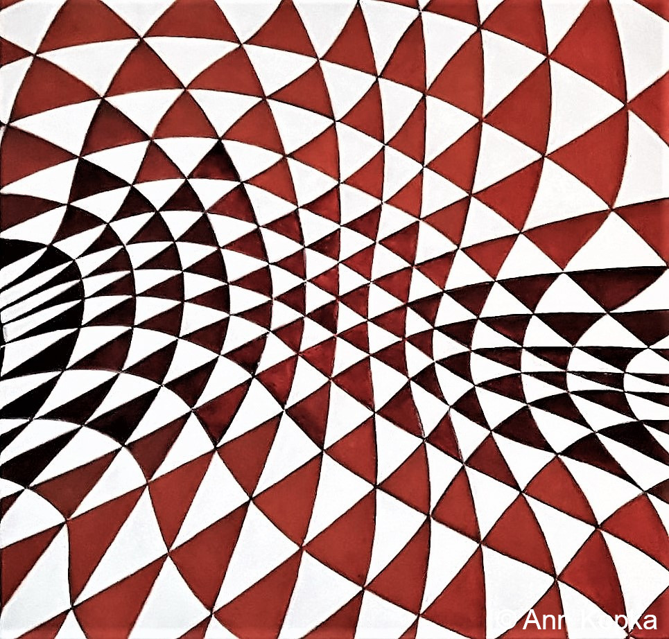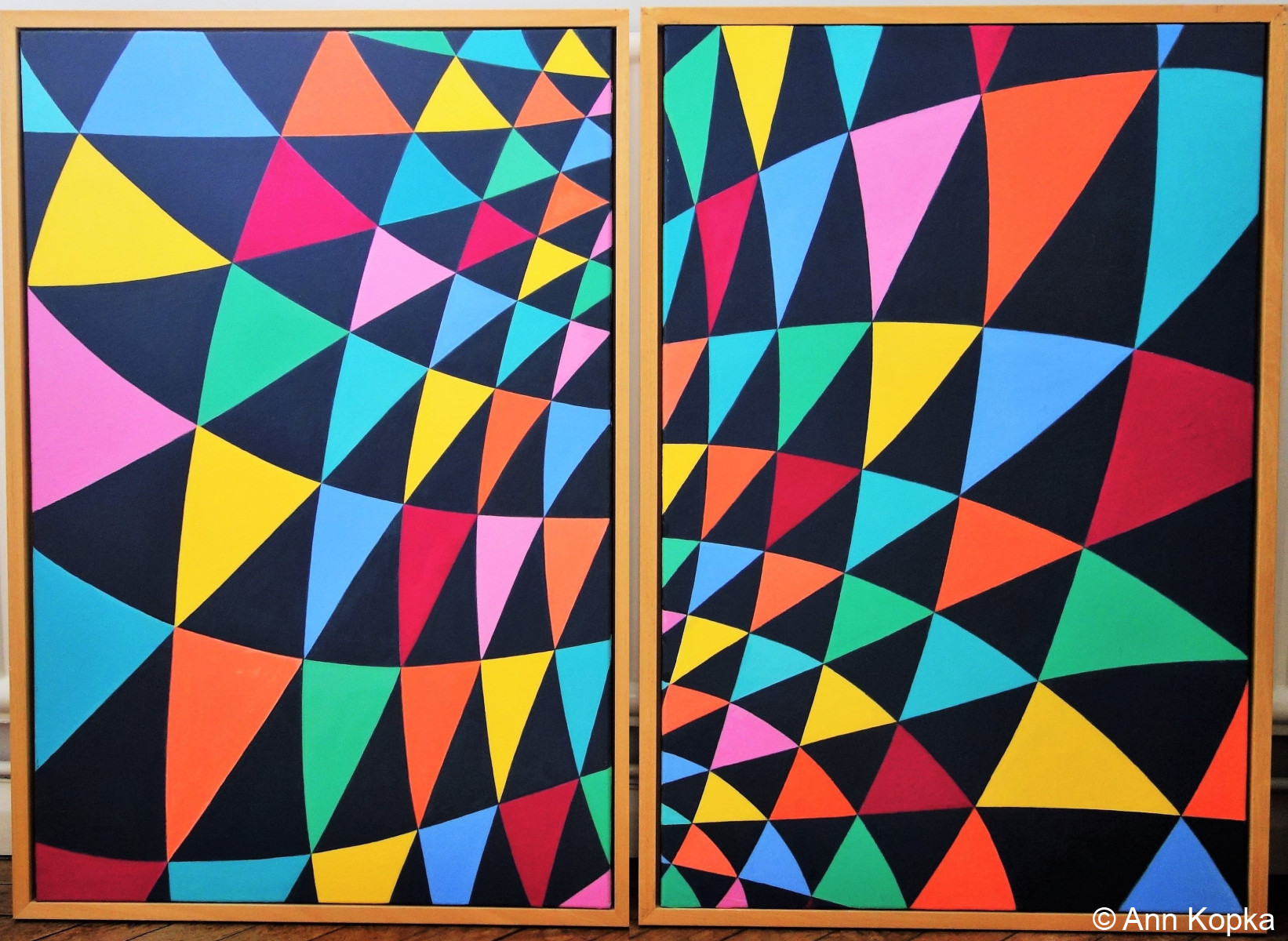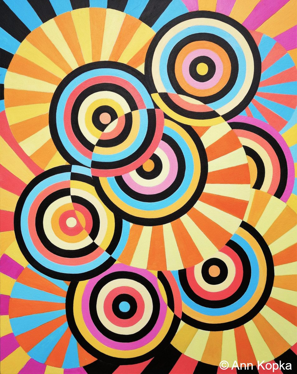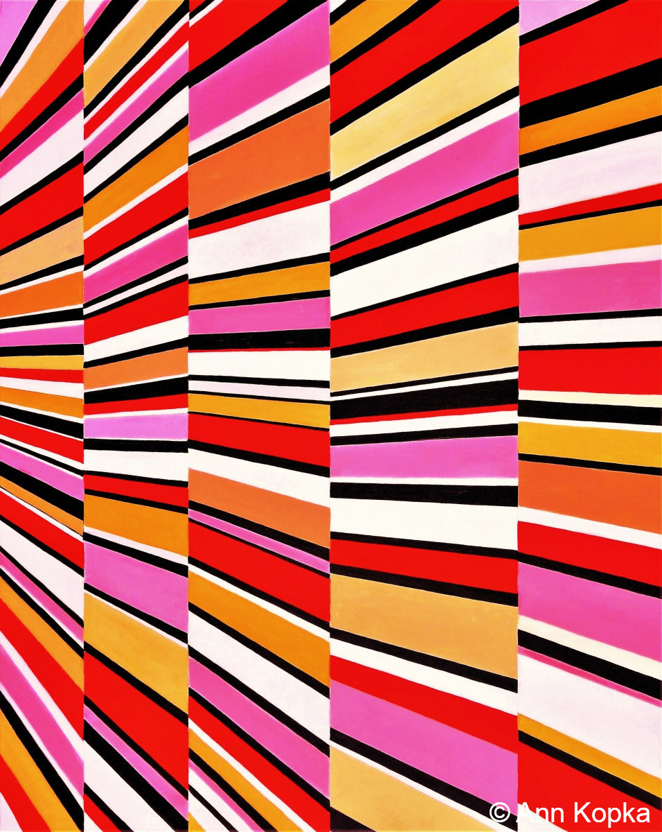 Geometric paintings informed by Ann Kopka’s fascination with the relationships between geometry, design and structures found in both urban and natural landscapes. Her colourful vibrant paintings explore the connections between colour and rhythm, structure and scale, repetition, and pattern. Ann’s paintings ‘grow’ through the subtle application of multiple layers of vivid acrylic colour. Colour is employed not to be representational but to convey light and energy, emphasise the circulation of movement and bind the network of structures together into a coherent picture. The slow buildup of vibrant saturated surfaces results in paintings that can have an illusion of depth sometimes with distinctive three-dimensional qualities, contradicting the defining flatness of abstract art and yet in art historical terms allude to analytical cubism, constructivism, op-art, and geometric abstraction.