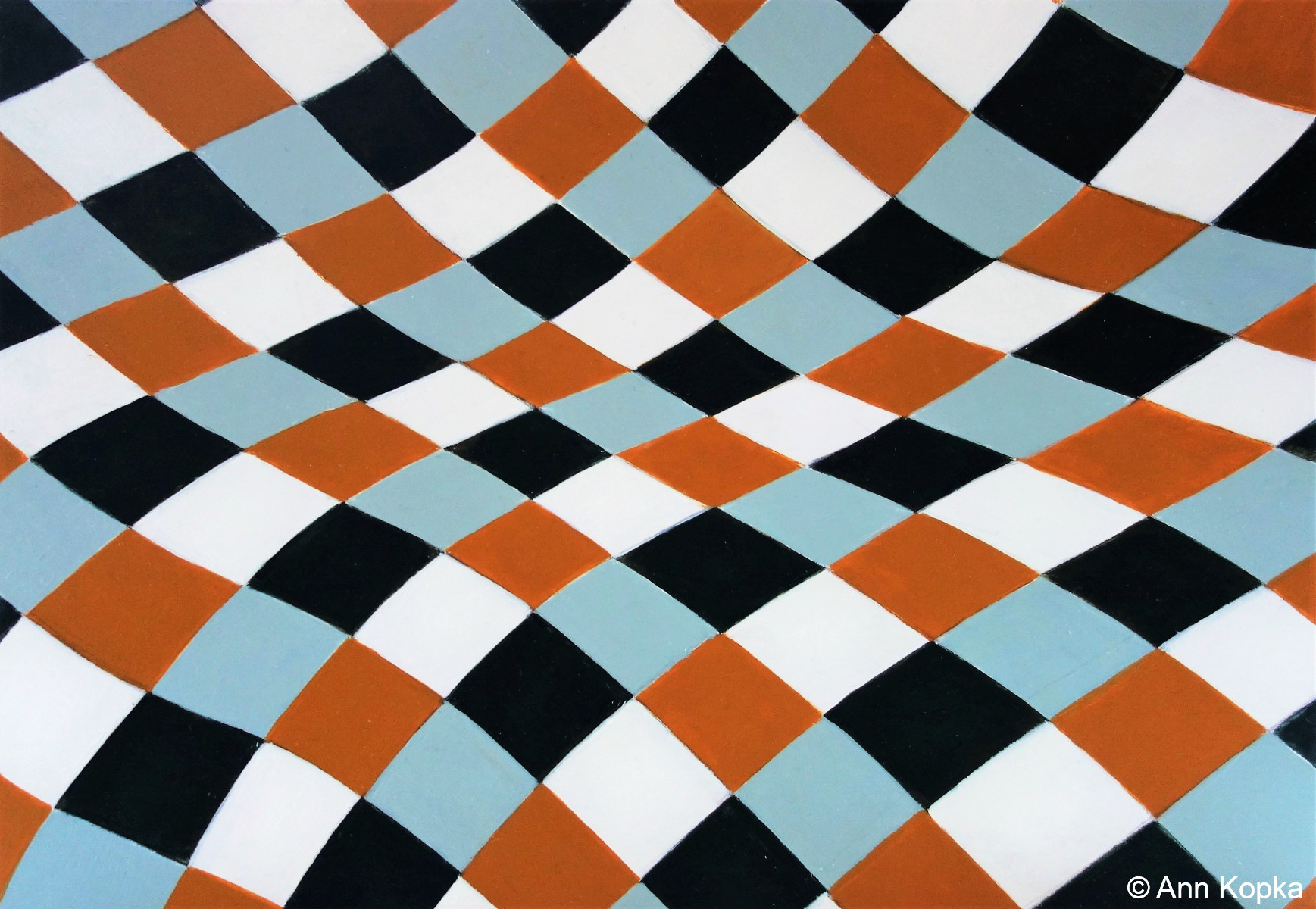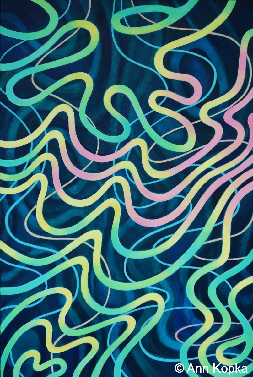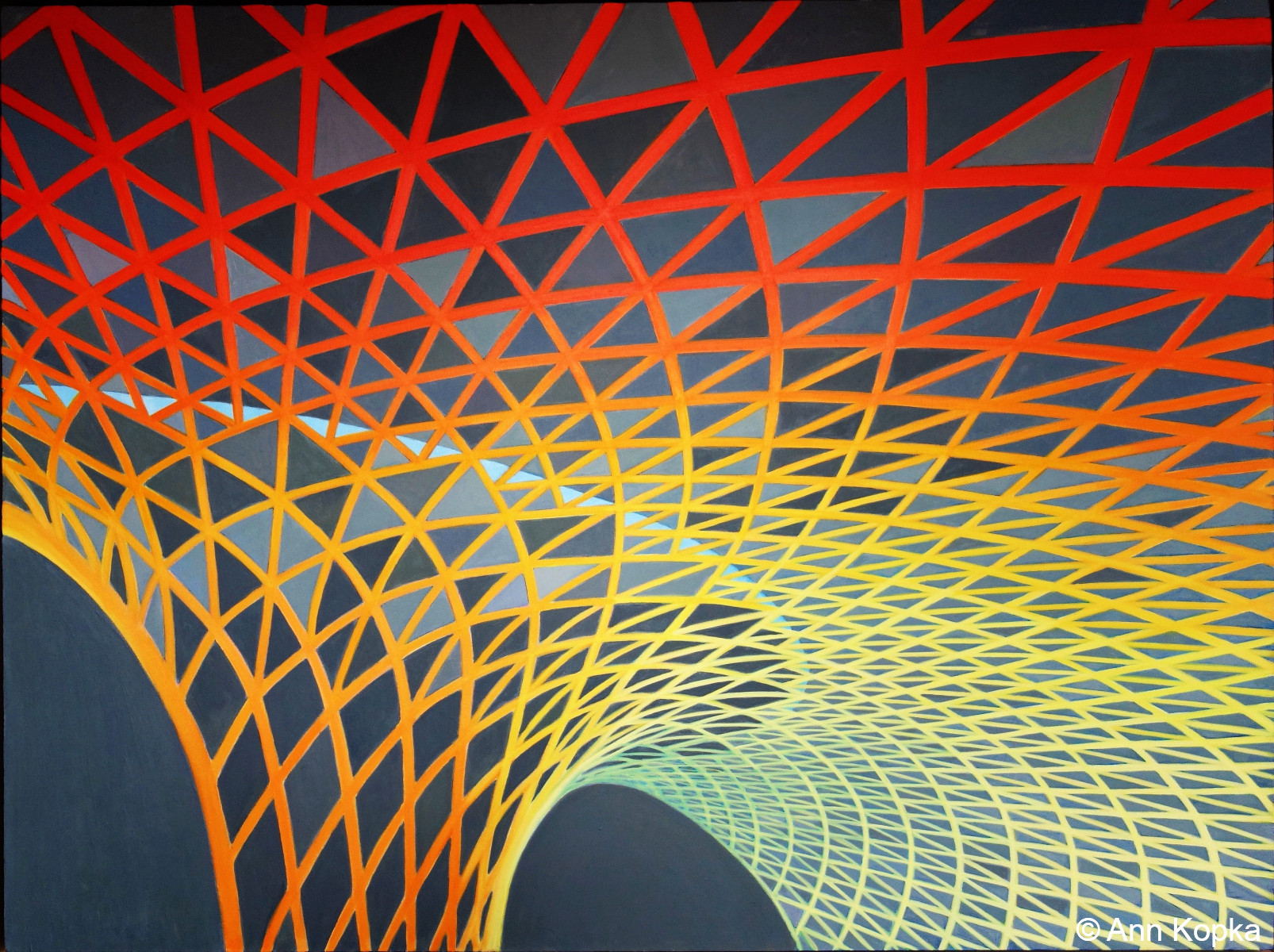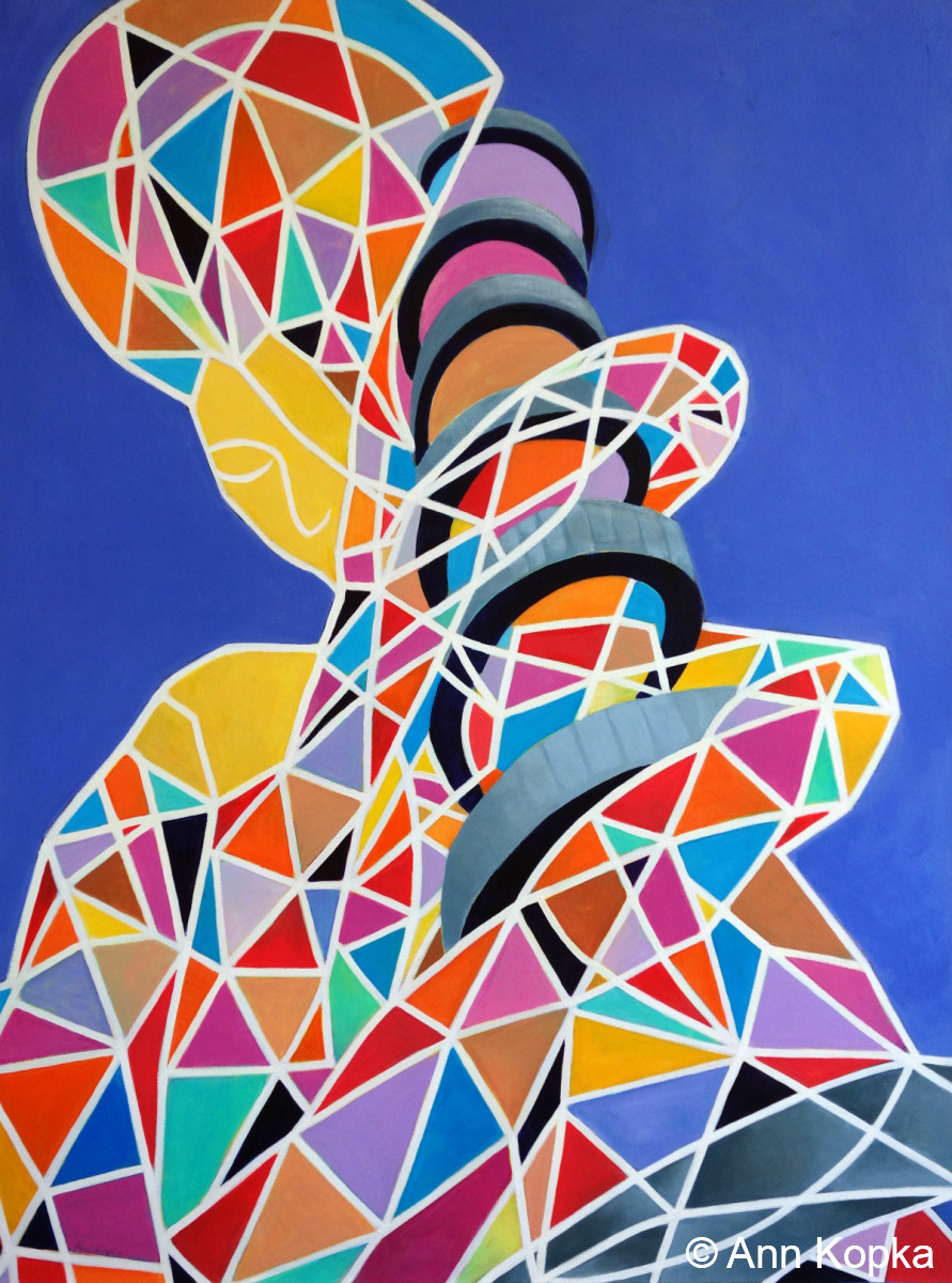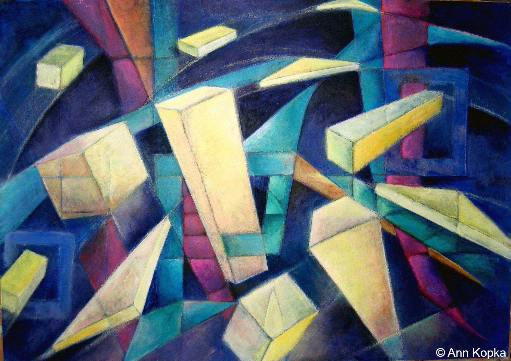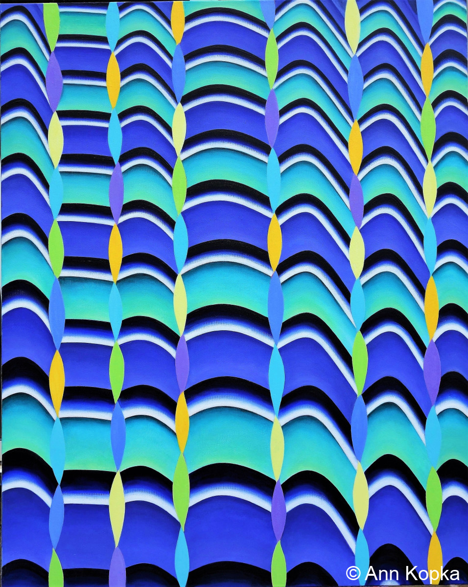 Geometric paintings informed by Ann Kopka’s fascination with the relationships between geometry, design and structures found in both urban and natural landscapes. Her colourful vibrant paintings explore the connections between colour and rhythm, structure and scale, repetition, and pattern. Ann’s paintings ‘grow’ through the subtle application of multiple layers of vivid acrylic colour. Colour is employed not to be representational but to convey light and energy, emphasise the circulation of movement and bind the network of structures together into a coherent picture. The slow buildup of vibrant saturated surfaces results in paintings that can have an illusion of depth sometimes with distinctive three-dimensional qualities, contradicting the defining flatness of abstract art and yet in art historical terms allude to analytical cubism, constructivism, op-art, and geometric abstraction.