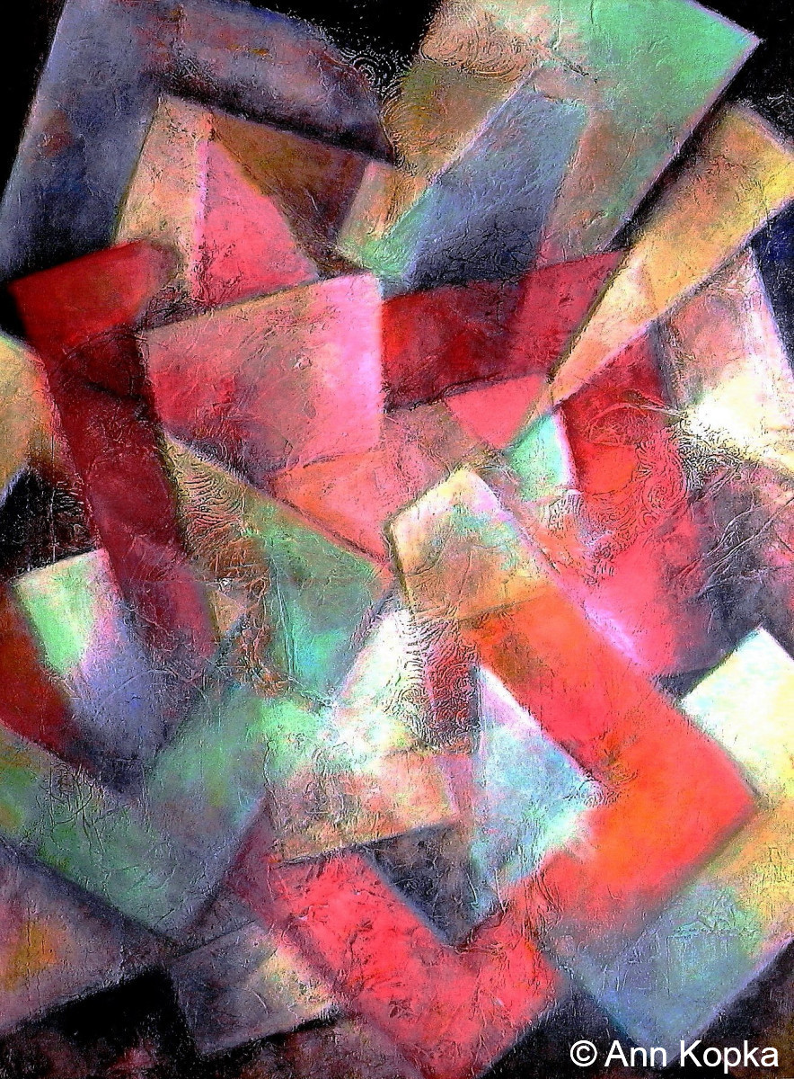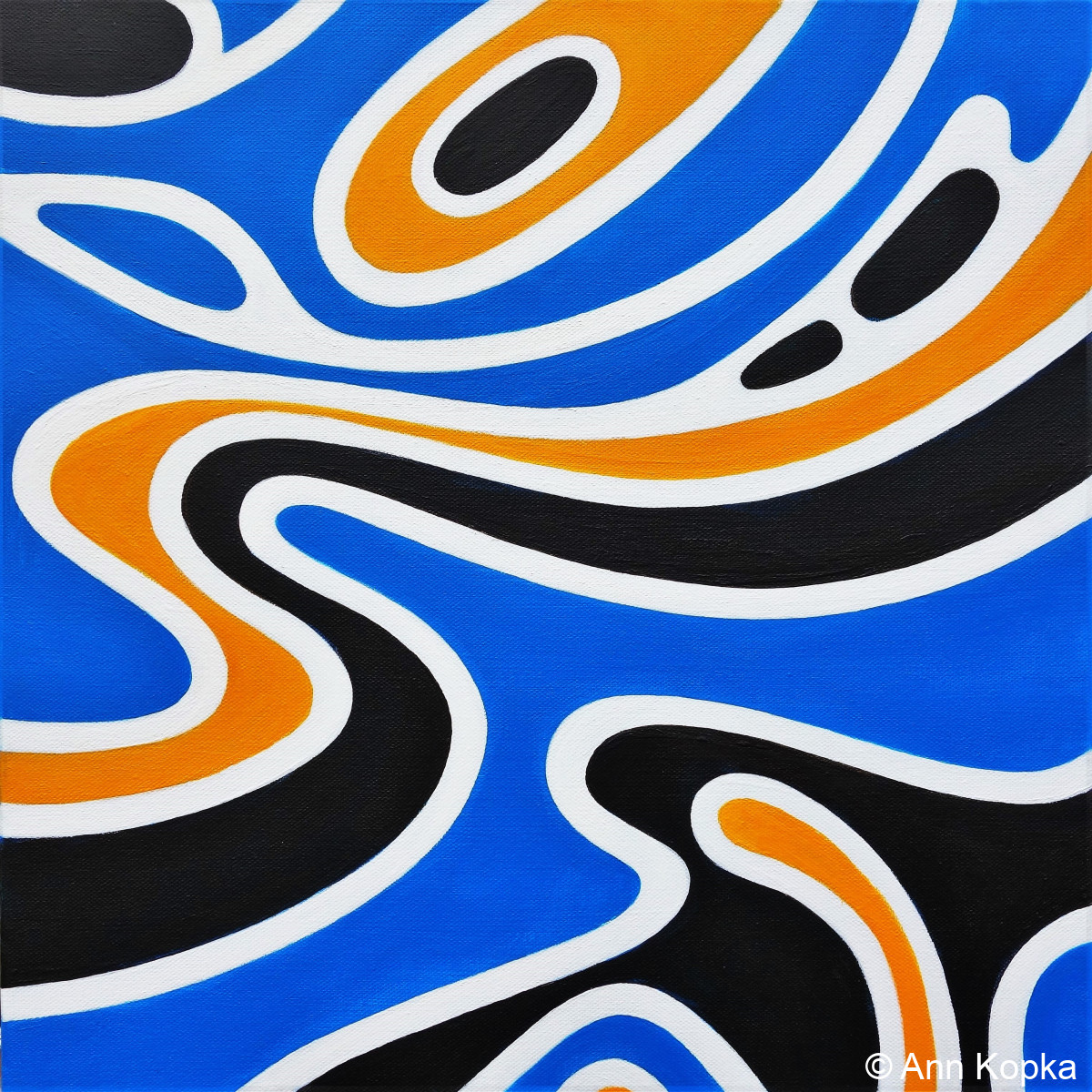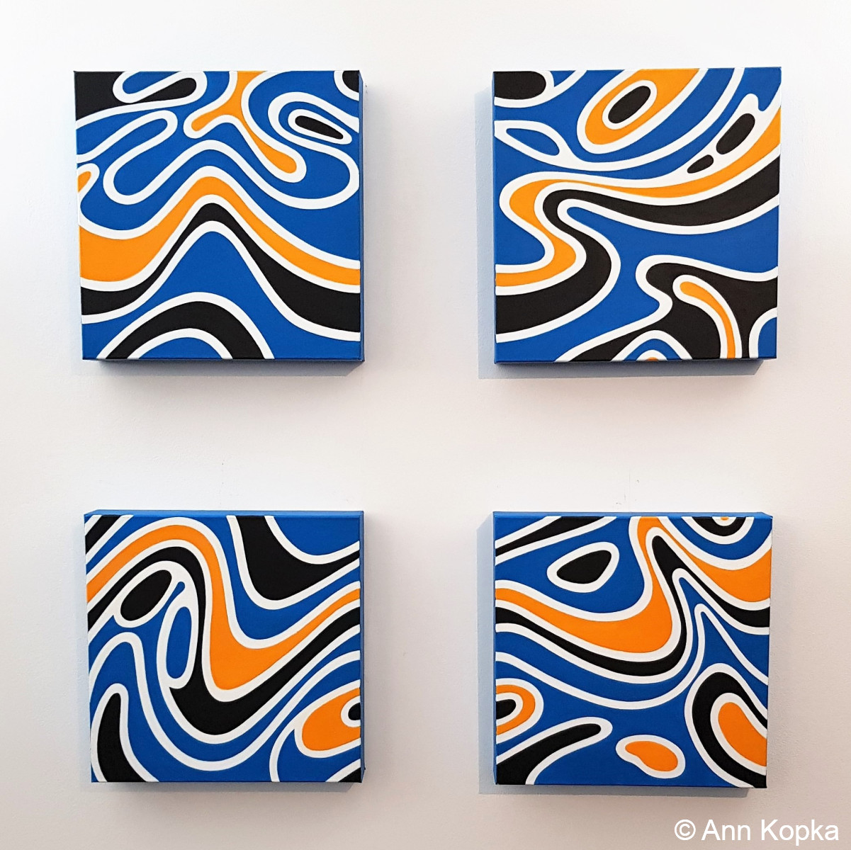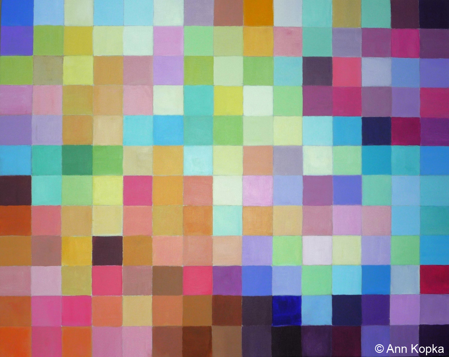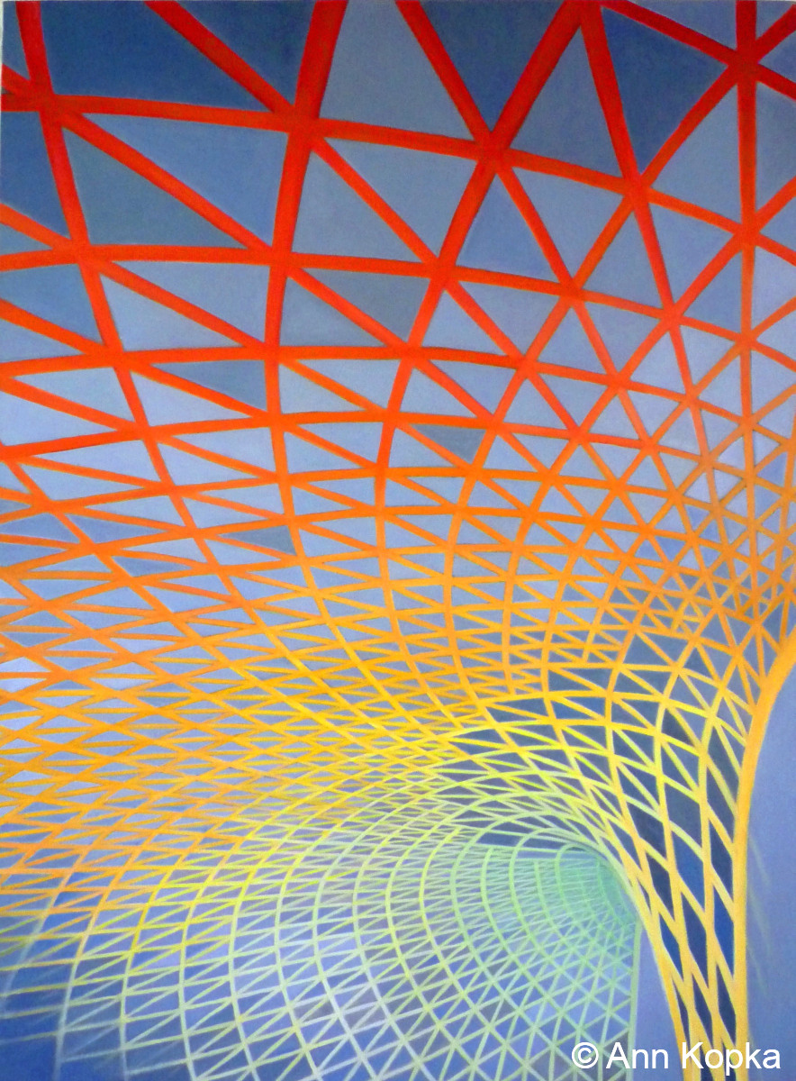 Geometric paintings informed by Ann Kopka’s fascination with the relationships between geometry, design and structures found in both urban and natural landscapes. Her colourful vibrant paintings explore the connections between colour and rhythm, structure and scale, repetition, and pattern. Ann’s paintings ‘grow’ through the subtle application of multiple layers of vivid acrylic colour. Colour is employed not to be representational but to convey light and energy, emphasise the circulation of movement and bind the network of structures together into a coherent picture. The slow buildup of vibrant saturated surfaces results in paintings that can have an illusion of depth sometimes with distinctive three-dimensional qualities, contradicting the defining flatness of abstract art and yet in art historical terms allude to analytical cubism, constructivism, op-art, and geometric abstraction.