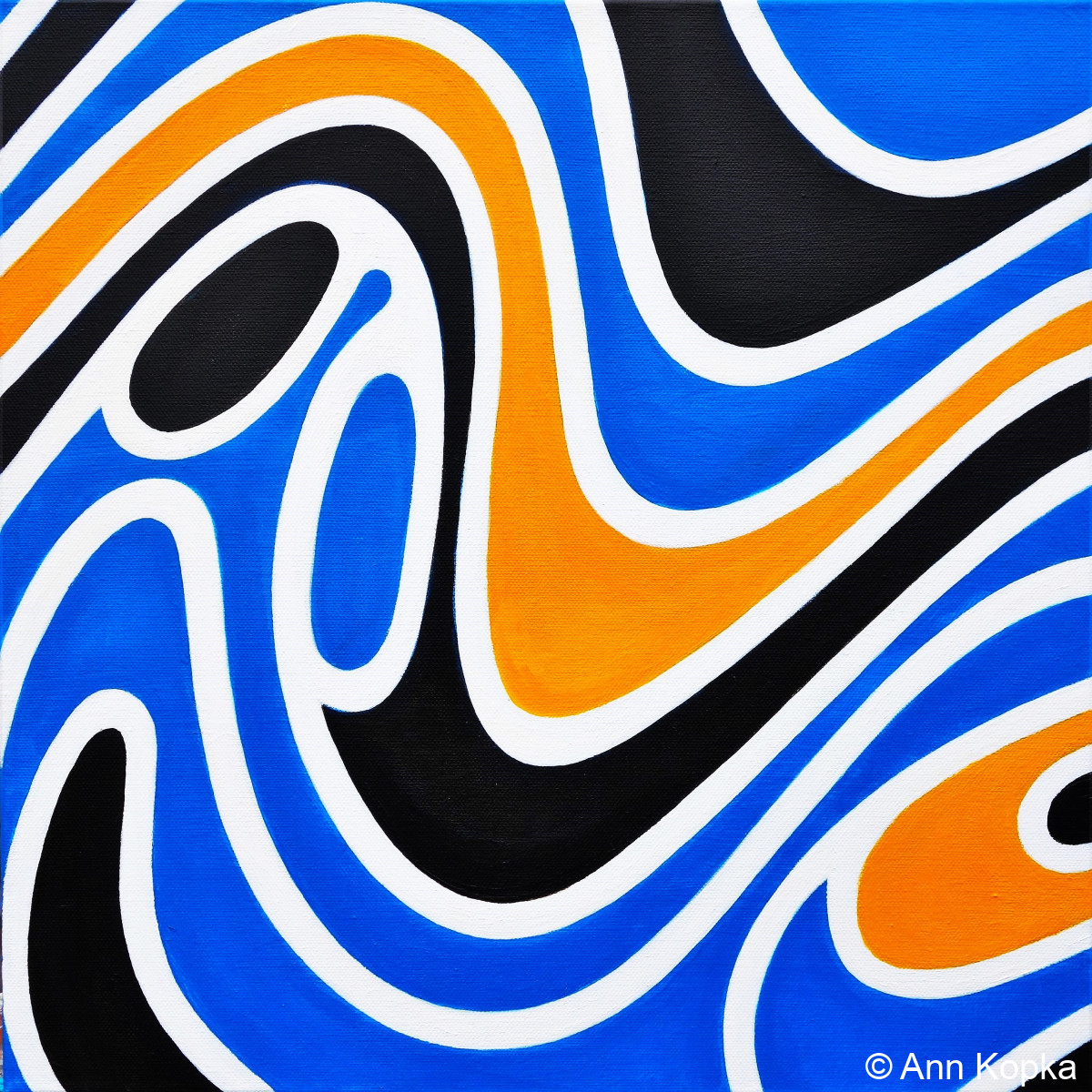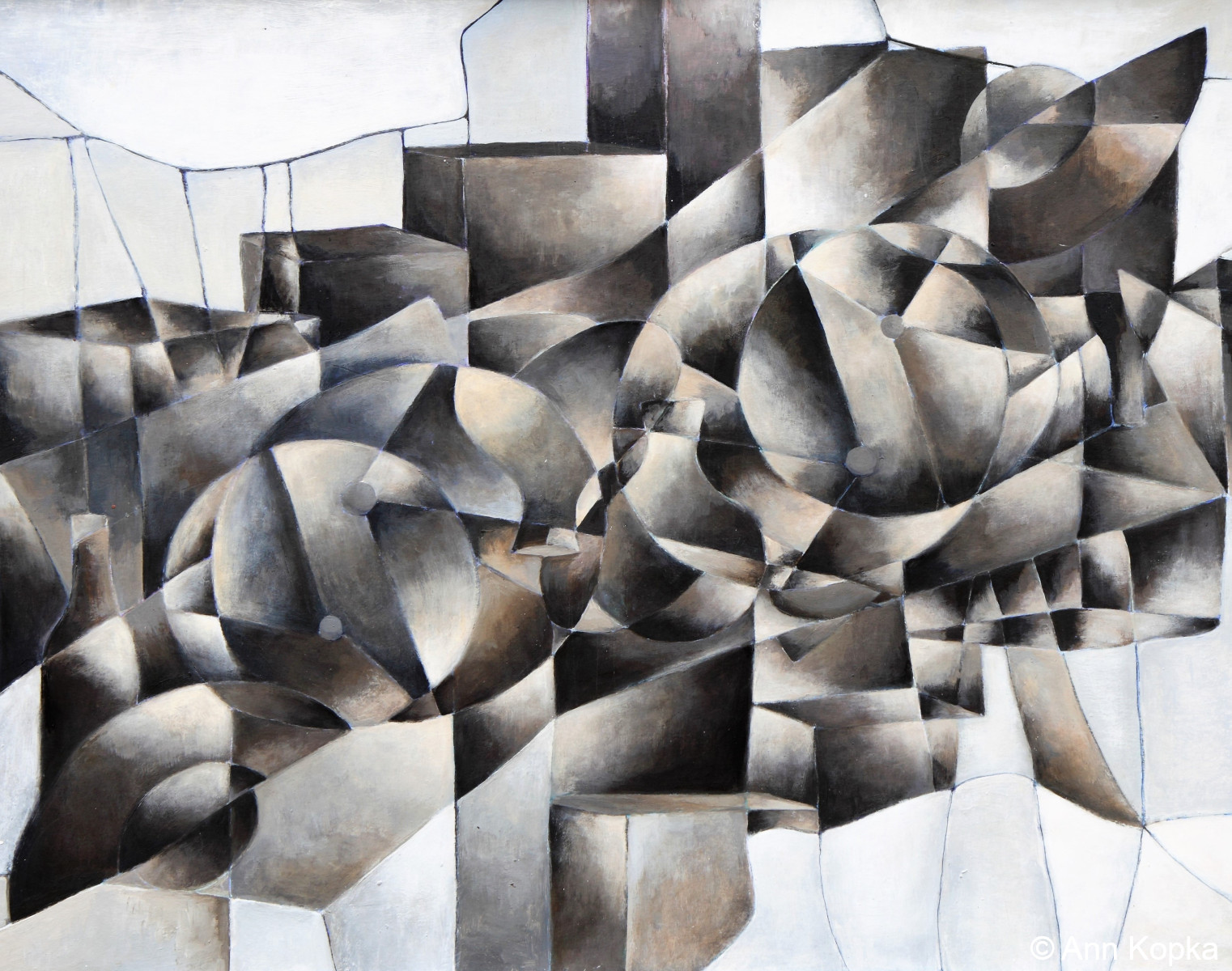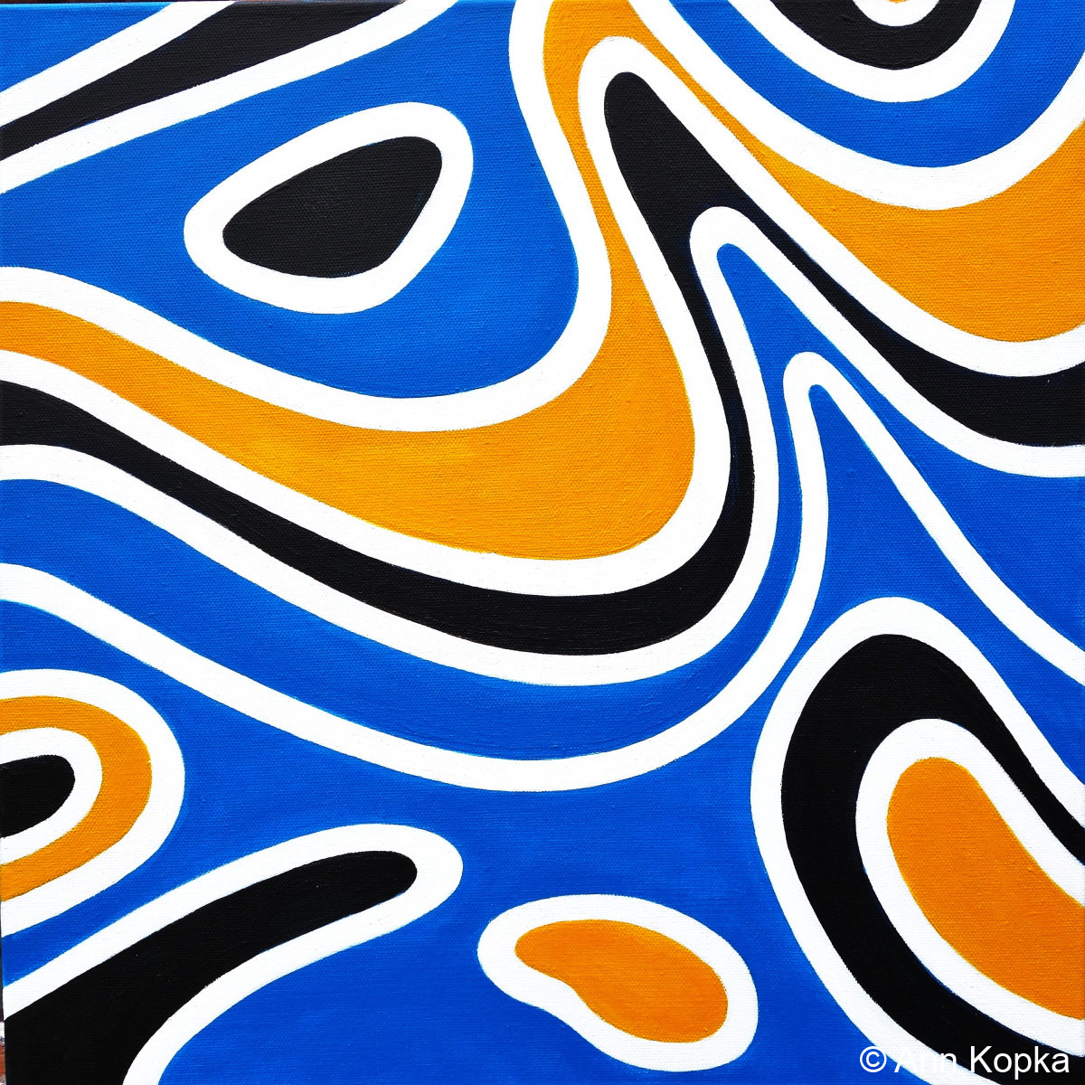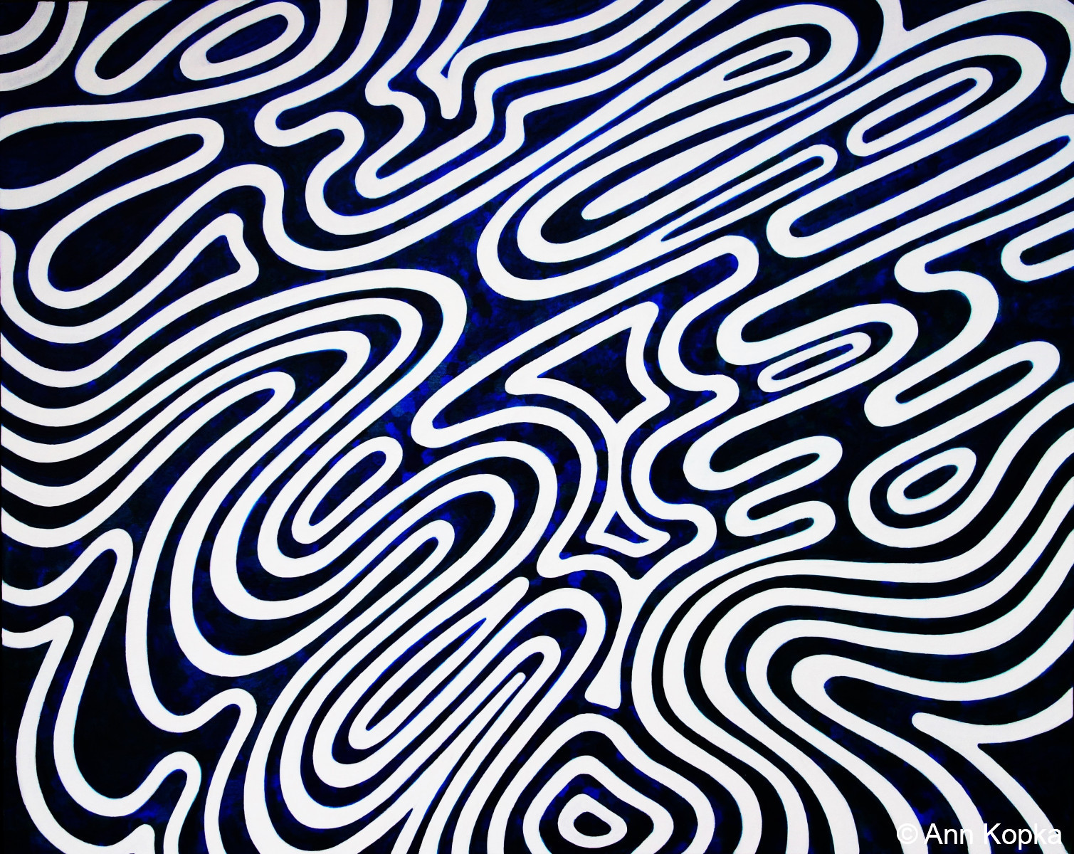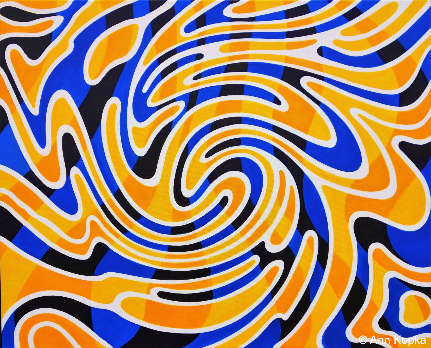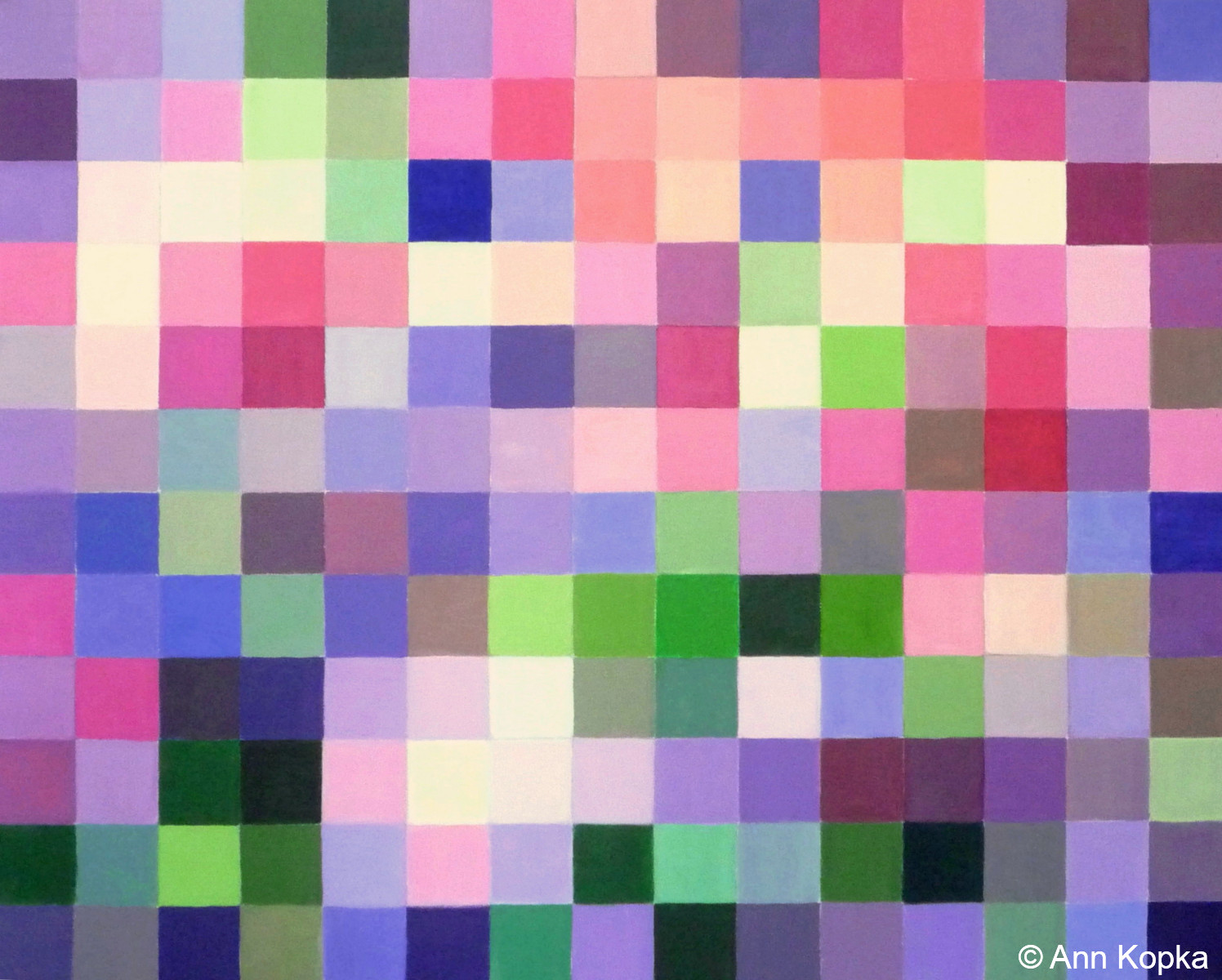 Geometric paintings informed by Ann Kopka’s fascination with the relationships between geometry, design and structures found in both urban and natural landscapes. Her colourful vibrant paintings explore the connections between colour and rhythm, structure and scale, repetition, and pattern. Ann’s paintings ‘grow’ through the subtle application of multiple layers of vivid acrylic colour. Colour is employed not to be representational but to convey light and energy, emphasise the circulation of movement and bind the network of structures together into a coherent picture. The slow buildup of vibrant saturated surfaces results in paintings that can have an illusion of depth sometimes with distinctive three-dimensional qualities, contradicting the defining flatness of abstract art and yet in art historical terms allude to analytical cubism, constructivism, op-art, and geometric abstraction.