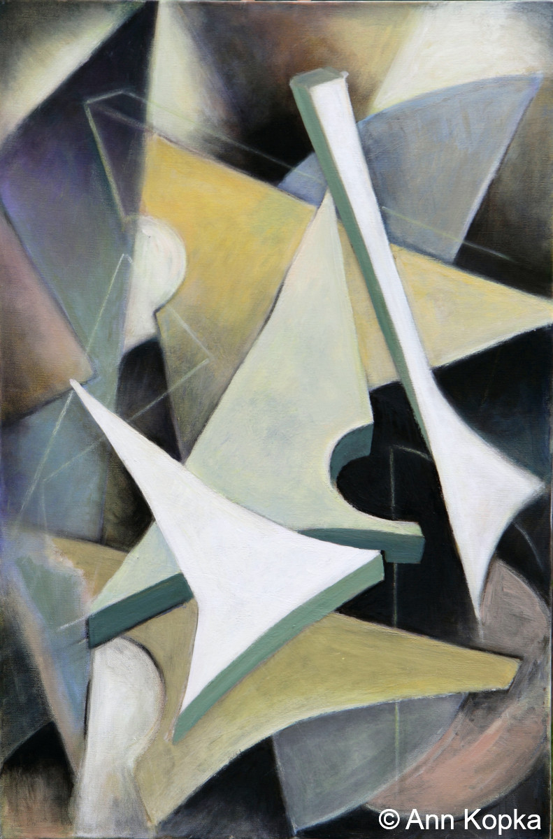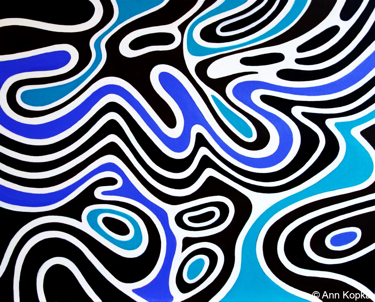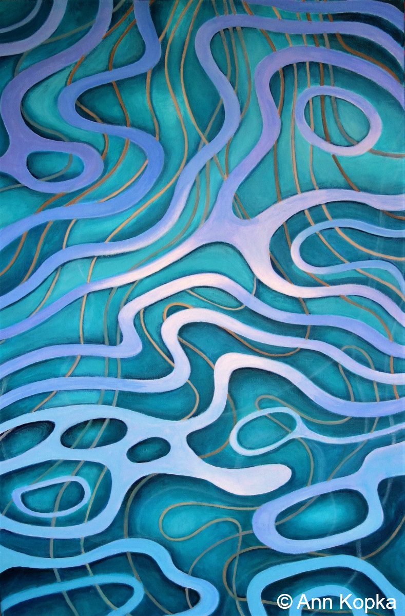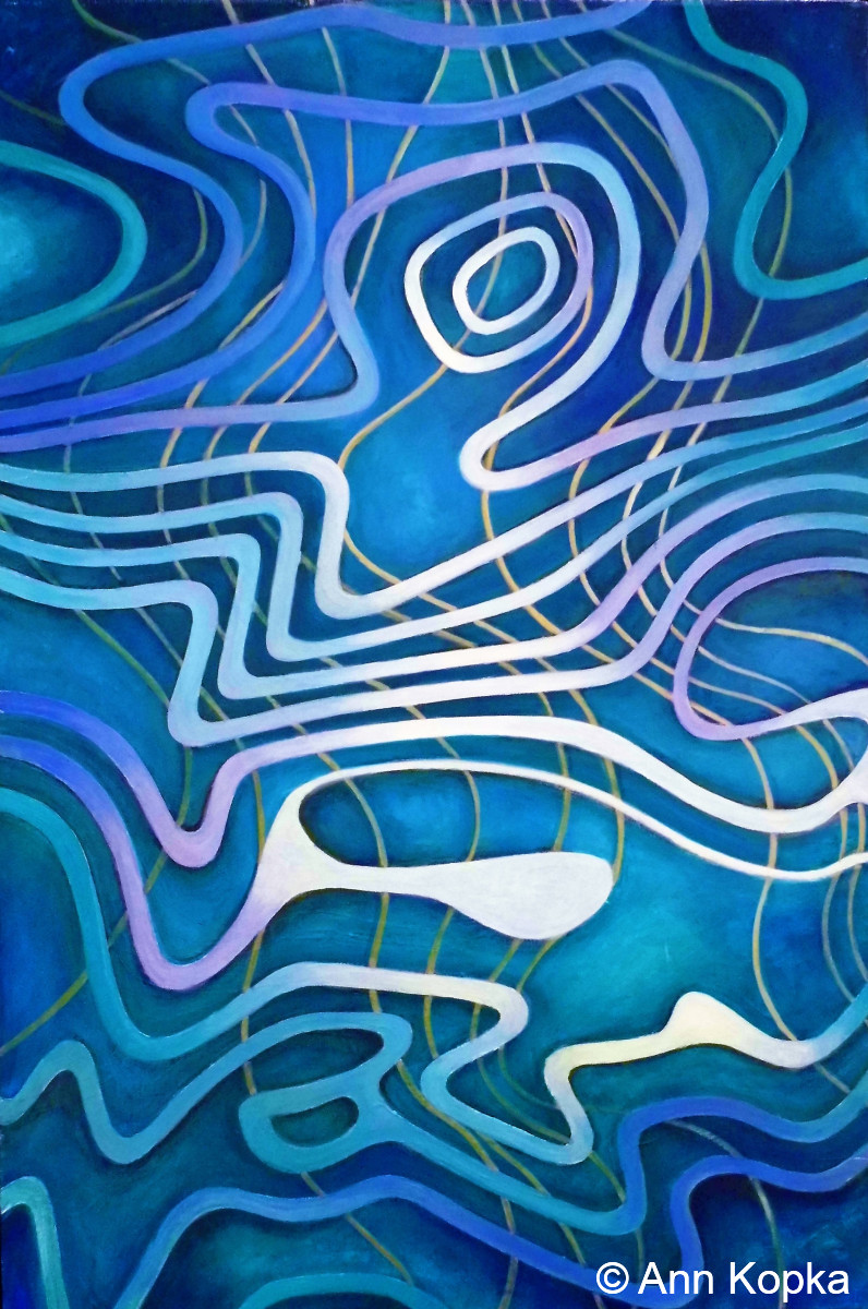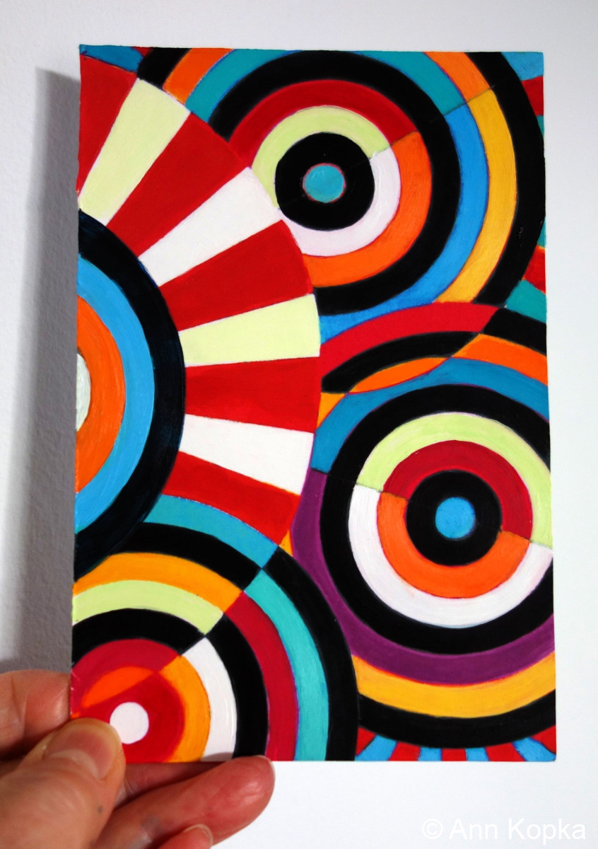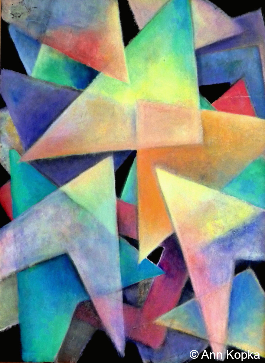 Geometric paintings informed by Ann Kopka’s fascination with the relationships between geometry, design and structures found in both urban and natural landscapes. Her colourful vibrant paintings explore the connections between colour and rhythm, structure and scale, repetition, and pattern. Ann’s paintings ‘grow’ through the subtle application of multiple layers of vivid acrylic colour. Colour is employed not to be representational but to convey light and energy, emphasise the circulation of movement and bind the network of structures together into a coherent picture. The slow buildup of vibrant saturated surfaces results in paintings that can have an illusion of depth sometimes with distinctive three-dimensional qualities, contradicting the defining flatness of abstract art and yet in art historical terms allude to analytical cubism, constructivism, op-art, and geometric abstraction.