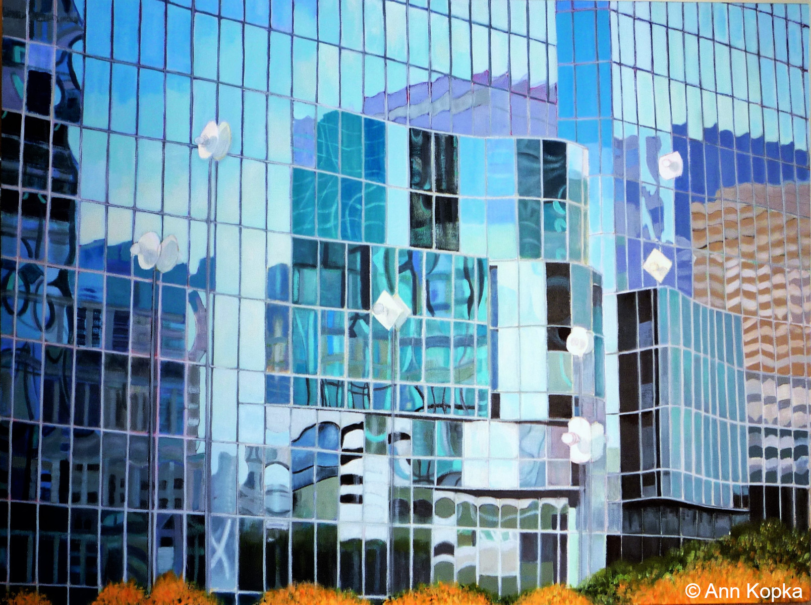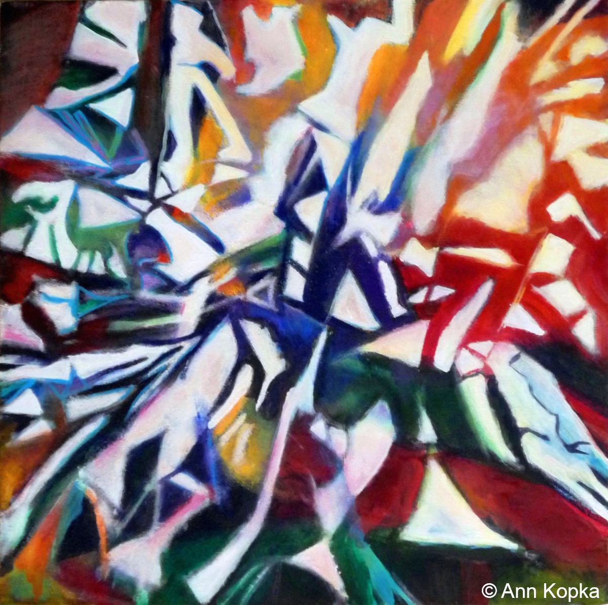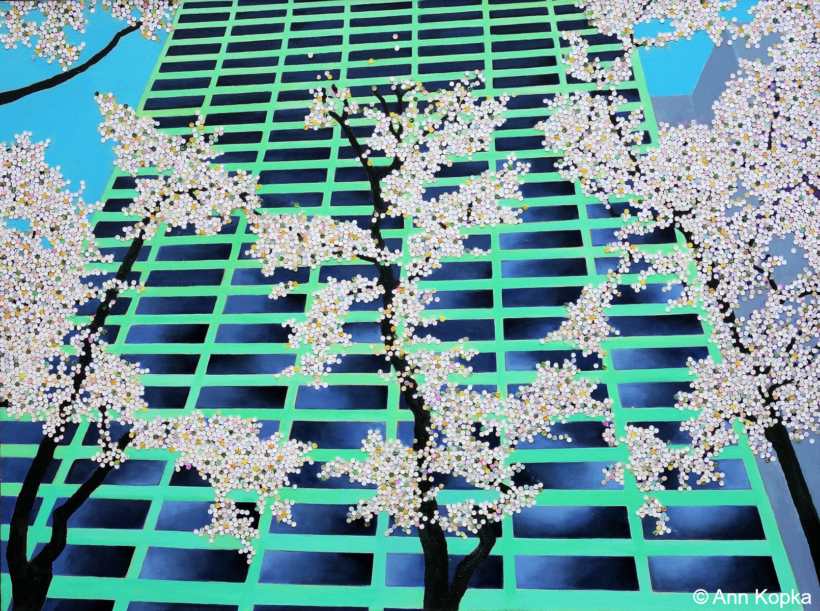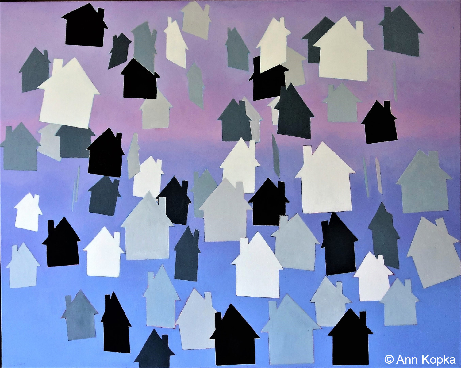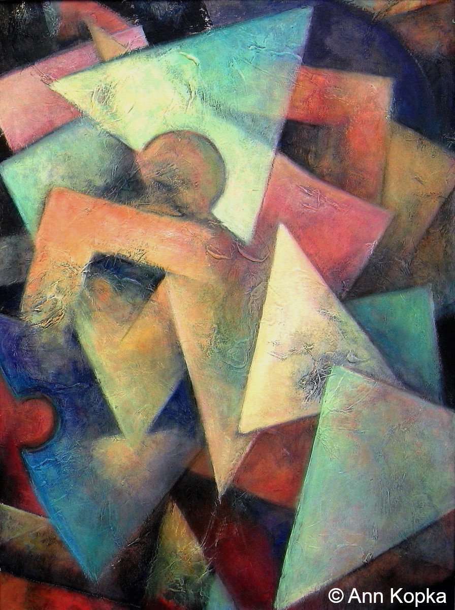Geometric paintings informed by Ann Kopka’s fascination with the relationships between geometry, design and structures found in both urban and natural landscapes. Her colourful vibrant paintings explore the connections between colour and rhythm, structure and scale, repetition, and pattern. Ann’s paintings ‘grow’ through the subtle application of multiple layers of vivid acrylic colour. Colour is employed not to be representational but to convey light and energy, emphasise the circulation of movement and bind the network of structures together into a coherent picture. The slow buildup of vibrant saturated surfaces results in paintings that can have an illusion of depth sometimes with distinctive three-dimensional qualities, contradicting the defining flatness of abstract art and yet in art historical terms allude to analytical cubism, constructivism, op-art, and geometric abstraction.